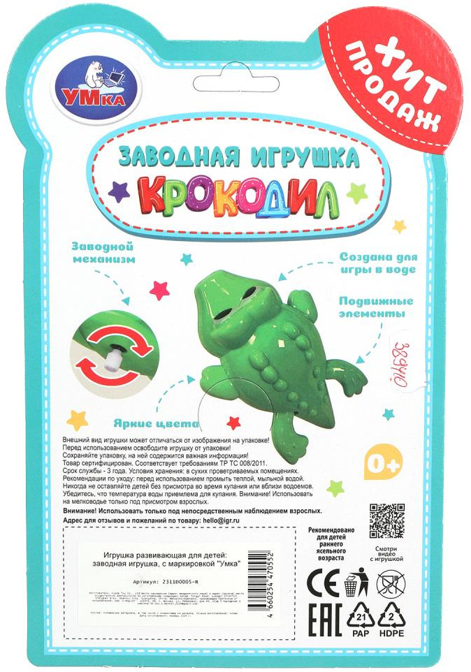 💳 Оплатить за товар можно при получении 🇰🇿 Есть бесплатная доставка по Казахстану от 1 дня 🎁 Копите бонусы с каждой покупки Заводная игрушка для ванны «Крокодил» ТМ «Умка» непременно позабавит малыша и подарит массу положительных эмоций в процессе игры. Заводная лягушка сделает купание ребёнка весёлым и интересным занятием. Если запустить механизм, он будет забавно плавать, активно двигаясь в воде, что несомненно увлечёт и развеселит малыша. |