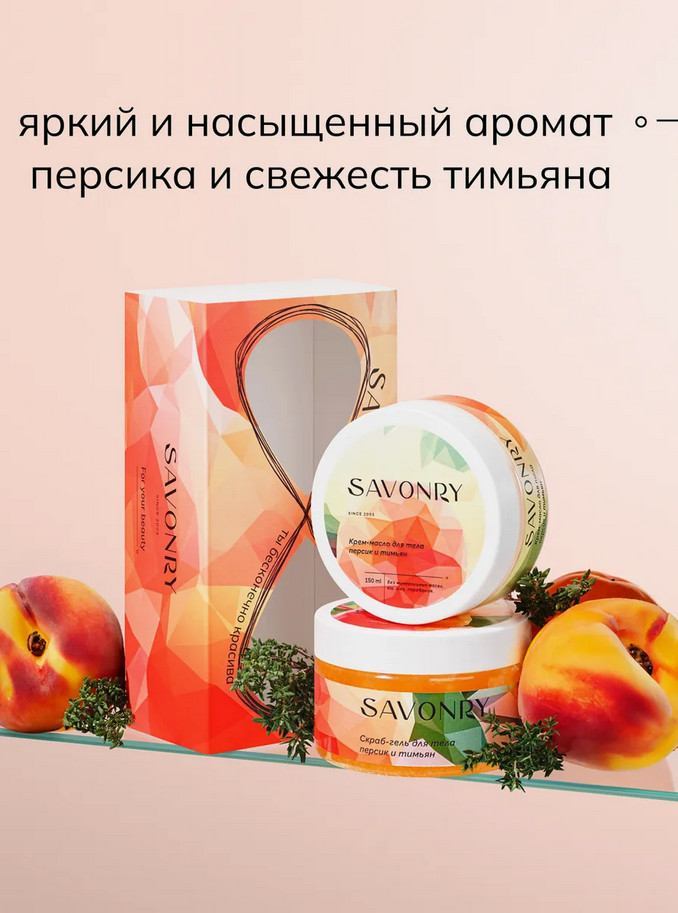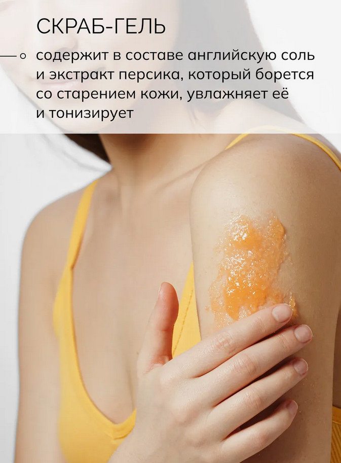 Скраб для тела: Magnesium Sulfate (английская соль), Sugar, Aqua, Helianthus Annuus (Sunflower) Seed Oil, Xanthan Gum, Prunus Persica (Peach) Kernel Oil (масло персика), Prunus Amygdalus Dulcis (Sweet Almond) Oil (масло сладкого миндаля), Sesamum Indicum (Sesame) Seed Oil (масло кунжутное), Olea Еuropaea (Olive) Oil (масло оливковое), Prunus Persica (Peach) Fruit Extract (экстракт персика), Parfum, C.I. 15985 (пищевые красители).