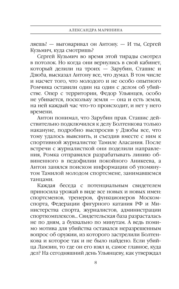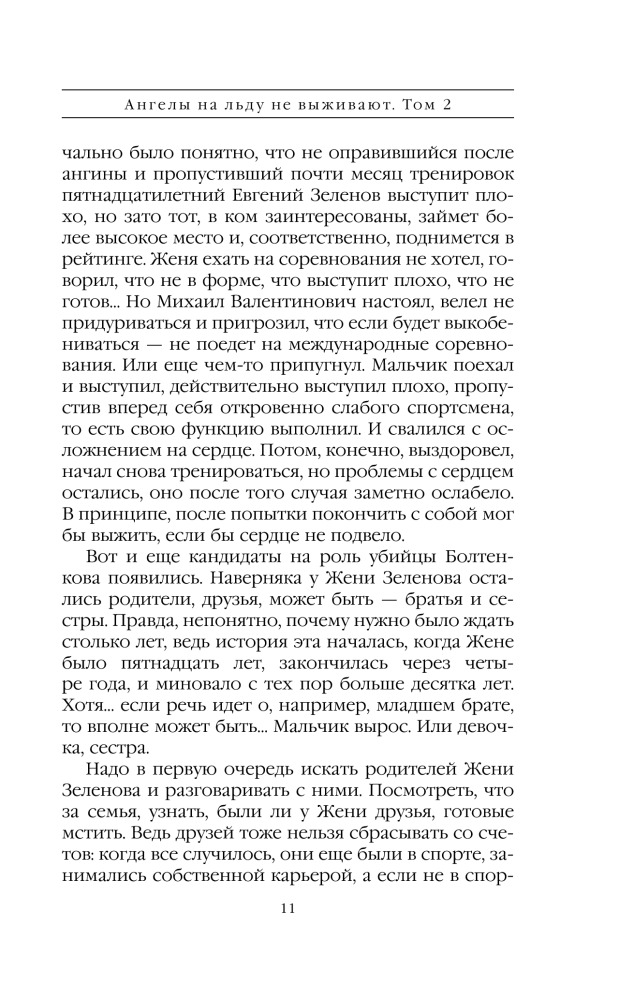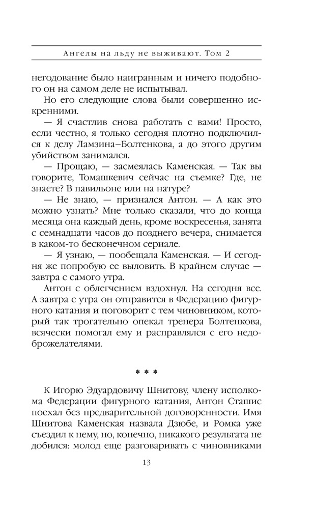 И вот, в этот сказочный мир мрачной тенью врывается жестокое убийство. Застрелен Михаил Валентинович Болтенков - тренер высшей категории, человек-легенда, мастер, взрастивший не одного чемпиона. Тело обнаружено у дома его коллеги Валерия Ламзина. Свидетели подтверждают: тренеры встречались перед убийством, они ругались и угрожали друг другу… Дело, как говорится, «в шляпе». Но у Насти Каменской и ее друзей с Петровки - Антона Сташиса и Романа Дзюбы - свое мнение на этот счет. Им открывается правда о бесчеловечностях и цинизме, пропитавших голубой лед. Лед, на котором ангелы не выживают… |