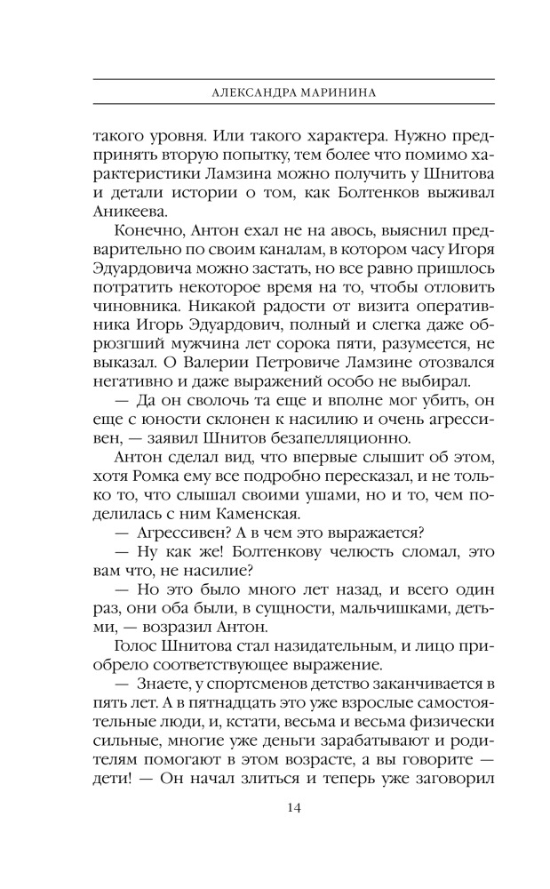 Александра Маринина (настоящее имя — Марина Анатольевна Алексеева) — российская писательница, автор произведений детективного жанра. Родилась во Львове, жила в Ленинграде, позднее переехала в Москву. Окончила юридический факультет МГУ и получила распределение в Академию МВД СССР. Карьеру в органах начала с должности лаборанта, затем была назначена на должность научного сотрудника и получила звание лейтенанта милиции. Занималась изучением личности преступника с аномалиями психики,... |