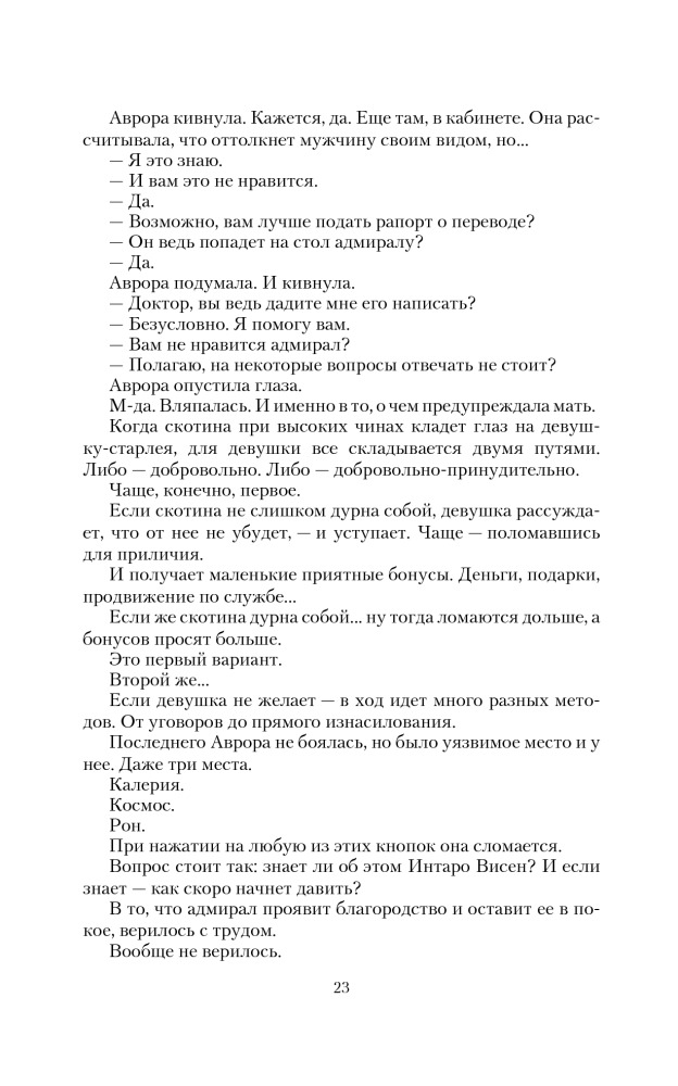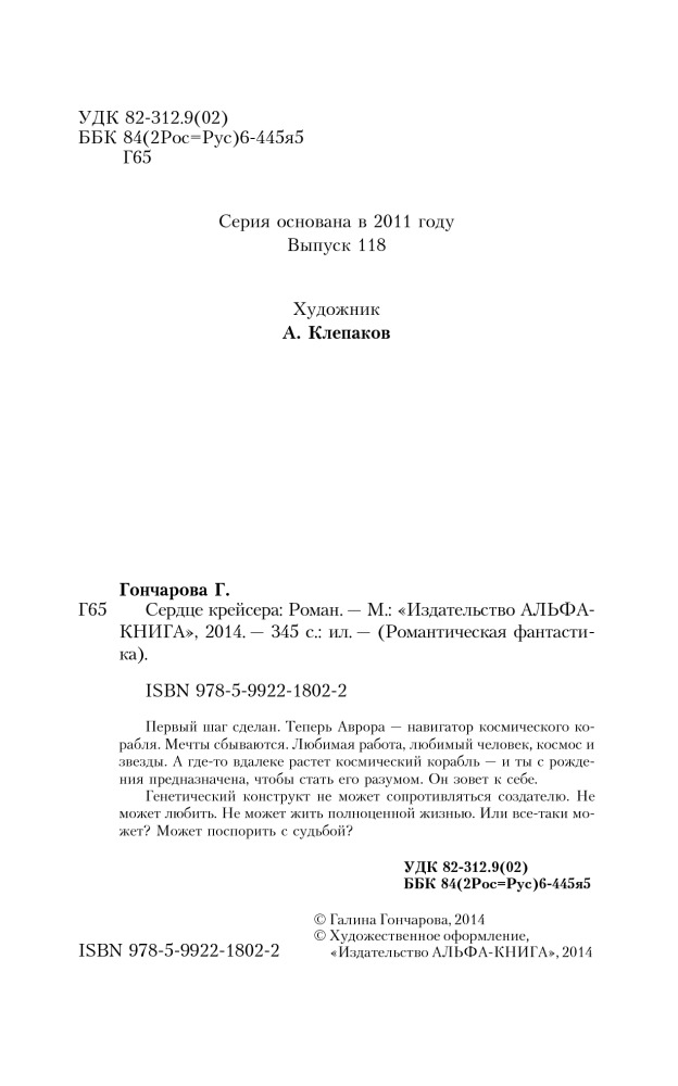Сердце крейсераВ данный момент этот товар отсутствует в продаже. Возможно, у нас найдется аналогичный или похожий товар здесь. Серия: Романтическая фантастика Первый шаг сделан. Теперь Аврора — навигатор космического корабля. Мечты сбываются. Любимая работа, любимый человек, космос и звезды. А где-то вдалеке растет космический корабль — и ты с рождения предназначена, чтобы стать его разумом. Он зовет к себе. |