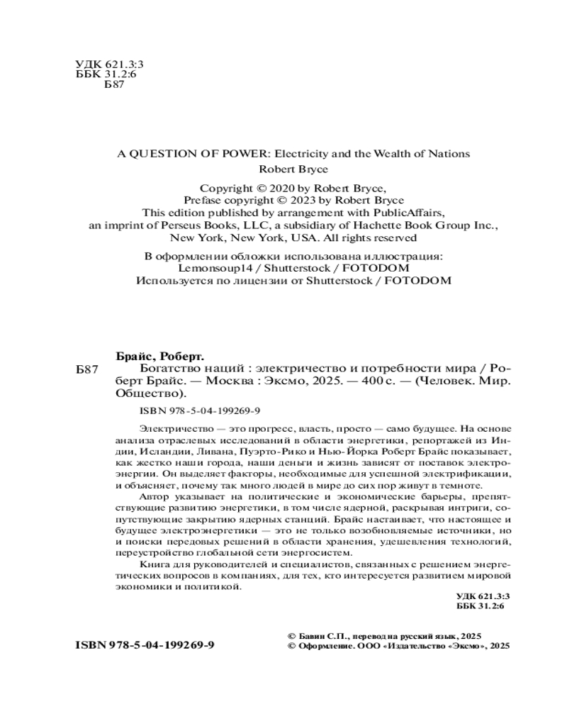 💳 Оплатить за товар можно при получении 🇰🇿 Есть бесплатная доставка по Казахстану от 1 дня 🎁 Копите бонусы с каждой покупки Серия: Человек. Мир. Общество. Глобальные проблемы современности Электричество охватило мир невидимой сетью, проникло во все уголки жизни и культуры, делая для человека возможным то, что было фантастикой еще каких-то сто-двести лет назад. При этом достижения влекут неожиданные вызовы: целые страны попадают в зависимость от ископаемого угля и энергетических мафий, генерация на основе атомного топлива подчас приводит к природным катаклизмам, проблемы хранения энергии требуют инновационных решений. Роберт Брайс в своем глубоком и разностороннем исследовании вопросов энергетики приглашает к осмыслению нашего «электрического настоящего» и подготовке к будущему, которое наступает с каждым новым подключением на планете, описывая новую эру энергетической независимости и экологической ответственности. Человечество ждут новые горизонты и неизведанные пути, на которых электрификация открывает доверие экономическому росту и социальной справедливости. |