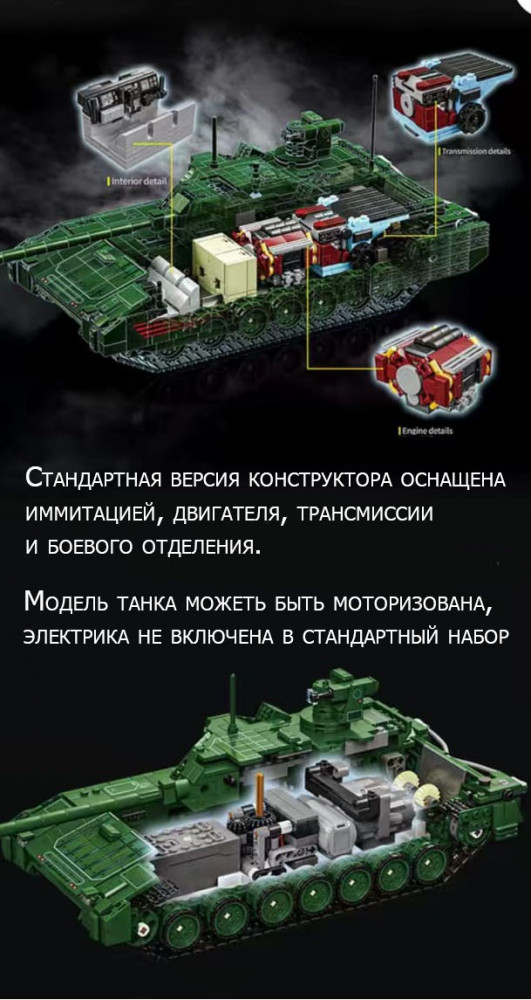 Одной из ключевых особенностей конструктора является возможность подвижности и функциональности собранной модели. Башня танка поворачивается на 360 градусов, гусеницы вращаются, что придает модели динамичность и позволяет воспроизводить игровые сцены. Конструктор также включает целый ряд внутренних и внешних элементов, позволяющих детализировать модель основного боевого танка. Боевая машина оснащена поднимающейся пушкой, имитацией дымовых гранат, антенной, элементами динамической защиты, смотровыми приборами, дистанционно управляемым пулеметом на башне и так далее.