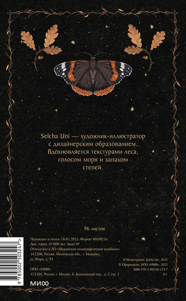 | Selcha Uni — художник-иллюстратор с дизайнерским образованием. Вдохновляется текстурами леса, голосом моря и запахом степей. После работы в Минприроды и нескольких лет фриланса окунулась в собственные проекты: производство сумок с авторскими принтами и других изделий, печать на ткани, календари и т. д. Сотрудничает с издательствами и брендами — от свечей ручной работы до одежды. |