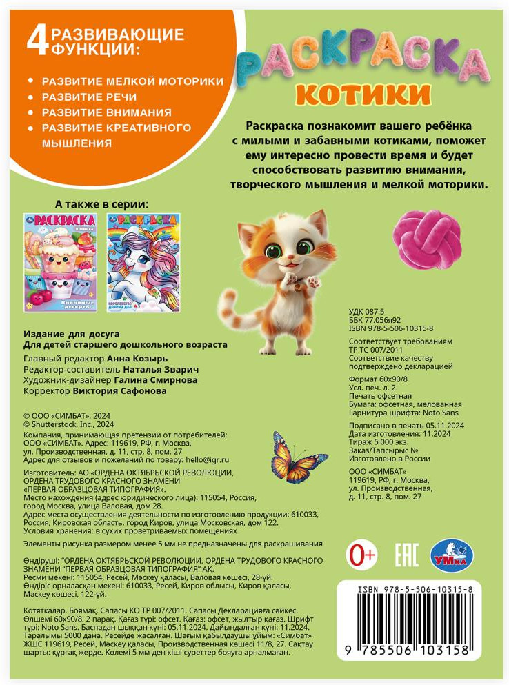 💳 Оплатить за товар можно при получении 🇰🇿 Есть бесплатная доставка по Казахстану 🎁 Копите бонусы с каждой покупки Раскраска «Котики» ТМ «УМка» — отличный подарок для юных художников: |