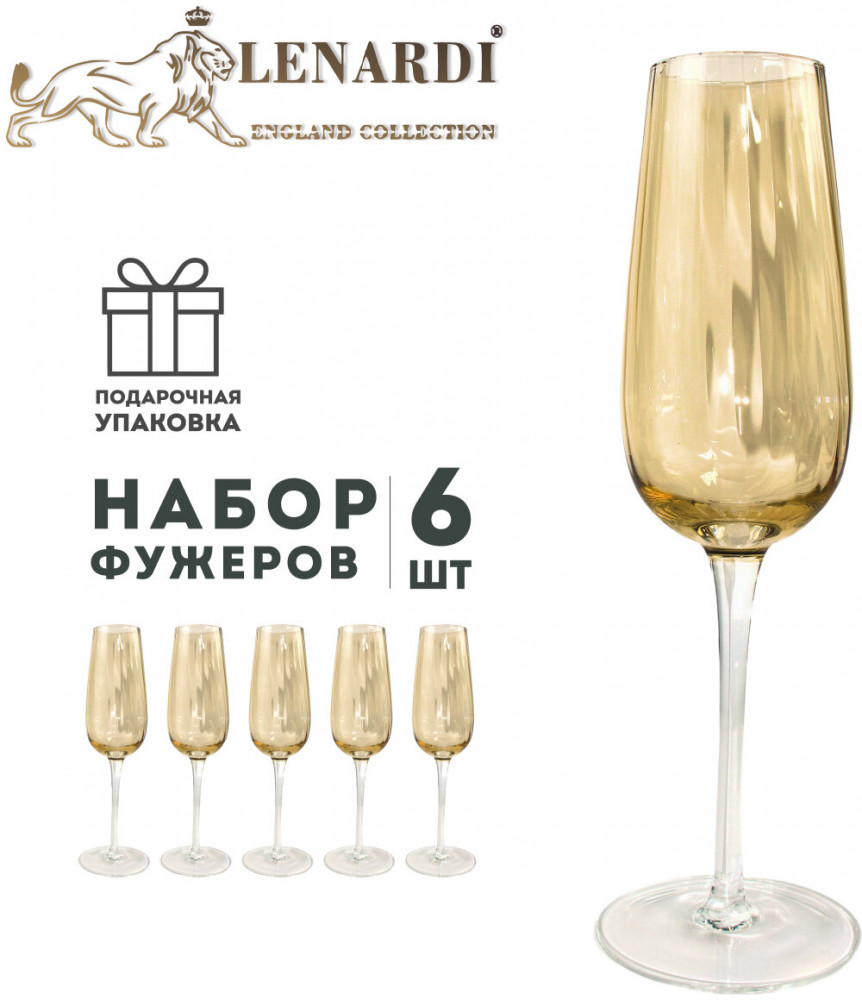 Приобретите этот набор из 6 жёлтых фужеров из цветного стекла и добавьте немного изыска вашему быту. Насладитесь каждым глотком вашего любимого напитка с этим элегантным набором! Lenardi — это бренд, который представляет изысканную коллекцию посуды, созданную для тех, кто ценит качество, стиль и элегантность. Изделия Lenardi изготавливаются из лучших материалов и отличаются оригинальными дизайнами, неповторимым стилем и безупречным качеством. Посуда от Lenardi призвана создавать атмосферу изысканности и роскоши при сервировке стола, делая каждый прием и ужин по-настоящему особенным и запоминающимся. Упакованное в подарочную коробку, это изделие станет отличным выбором для подарка близкому человеку или коллеге. Дарите радость и красоту в каждой детали — удивляйте своих близких прекрасными подарками!