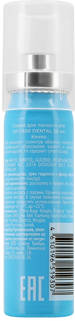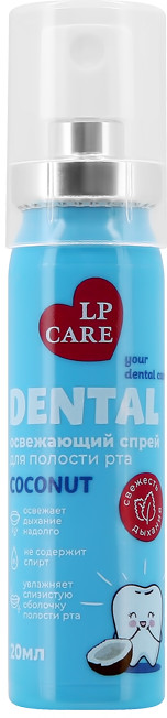 Спрей для полости рта LP Care Dental Coconut с ароматом кокоса увлажняет слизистую оболочку полости рта, предотвращает образование кариеса и освежает дыхание надолго. Не содержит спирта и сахара.