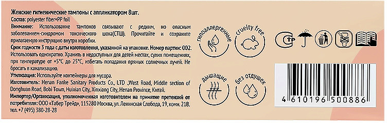 Меры предосторожности: использование тампонов связывают с редким, но опасным заболеванием-синдромом токсического шока(СТШ). Прочитайте и сохраните прилагаемую инструкцию внутри коробки.
