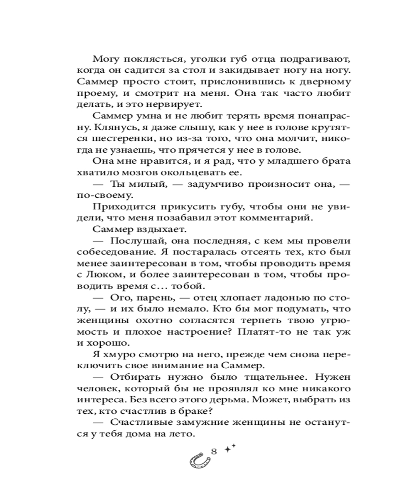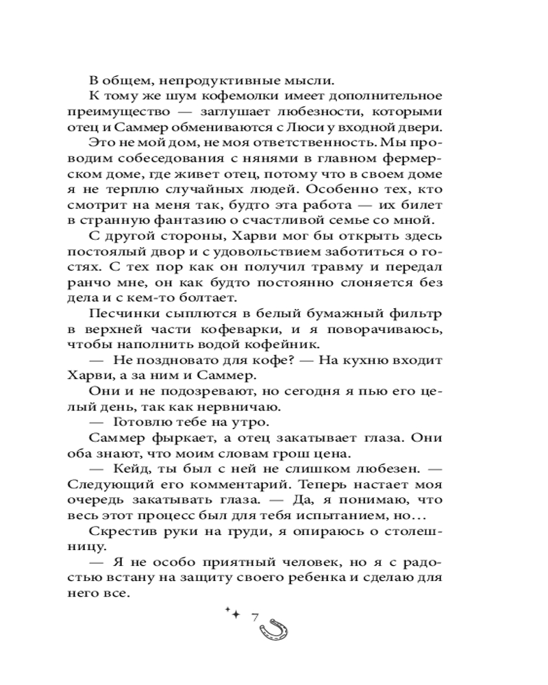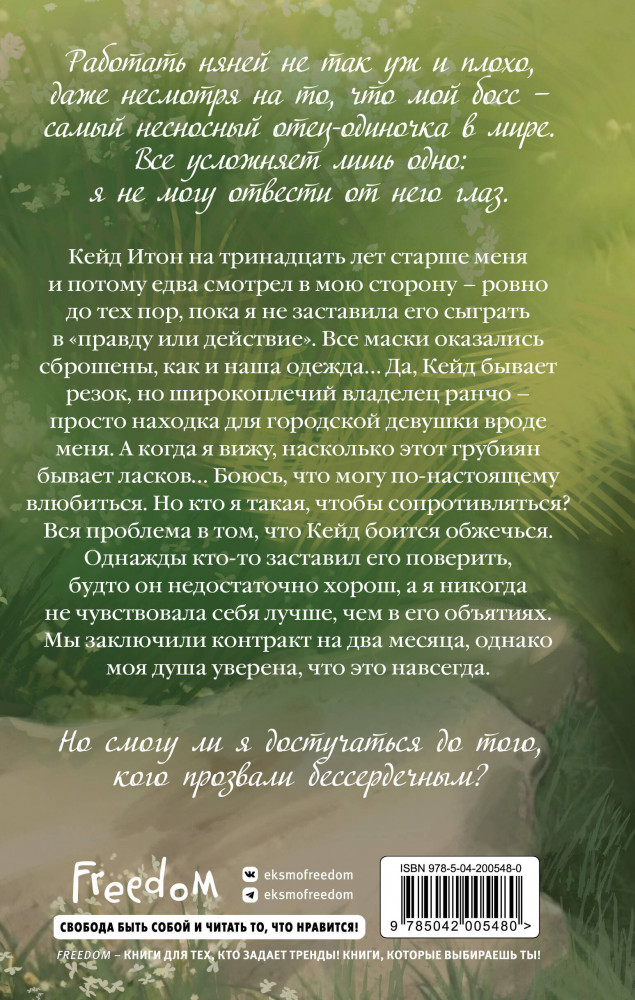 Работать няней не так уж и плохо, даже несмотря на то, что мой босс — самый несносный отец-одиночка в мире. Все усложняет лишь одно: я не могу отвести от него глаз. Кейд Итон на тринадцать лет старше меня и потому едва смотрел в мою сторону — ровно до тех пор, пока я не заставила его сыграть в «правду или действие». Все маски оказались сброшены, как и наша одежда... Да, Кейд бывает резок, но широкоплечий владелец ранчо — просто находка для городской девушки вроде меня. А когда я вижу, насколько этот грубиян бывает ласков... Боюсь, что могу по-настоящему влюбиться. Но кто я такая, чтобы сопротивляться? Вся проблема в том, что Кейд боится обжечься. Однажды кто-то заставил его поверить, будто он недостаточно хорош, а я никогда не чувствовала себя лучше, чем в его объятиях. Мы заключили контракт на два месяца, однако моя душа уверена, что это навсегда. Но смогу ли я достучаться до того, кого прозвали бессердечным? |