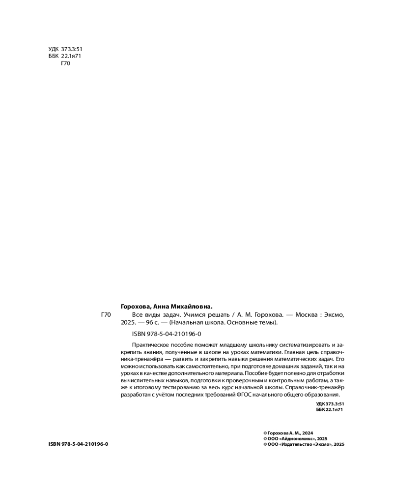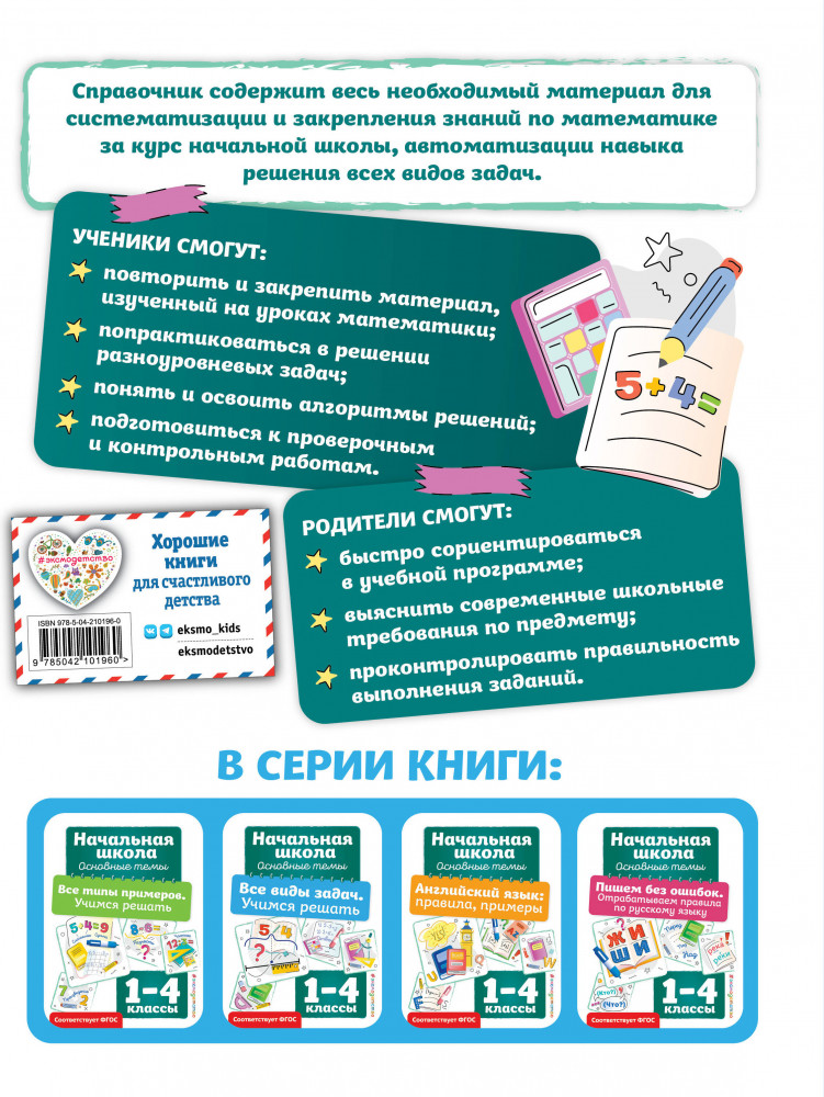 💳 Оплатить за товар можно при получении 🇰🇿 Есть бесплатная доставка по Казахстану от 1 дня 🎁 Копите бонусы с каждой покупки Серия: Начальная школа. Основные темы Данное пособие — одновременно и справочник, и тренажёр для помощи младшим школьникам в изучении математики. Здесь собраны все виды арифметических задач и необходимый для их решения теоретический материал. Он подаётся таким образом, чтобы ученик мог надёжно закрепить пройденные в школе темы, отработать их практически и эффективно подготовиться к самостоятельным и контрольным работам, а также к итоговой аттестации за курс начальной школы по математике. Справочный материал поможет родителям при необходимости быстро разобраться в теме и проверить выполнение ребёнком практических заданий, а также объяснить и помочь ему при возникновении трудностей. Пособие подготовлено в соответствии с последними требованиями ФГОС начального общего образования. |