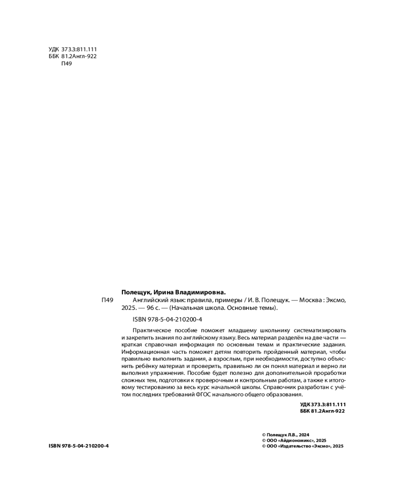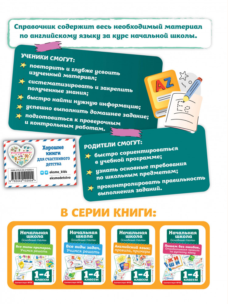 💳 Оплатить за товар можно при получении 🇰🇿 Есть бесплатная доставка по Казахстану 🎁 Копите бонусы с каждой покупки Серия: Начальная школа. Основные темы Данное пособие — одновременно и справочник, и тренажёр. Это отличный помощник для младших школьников в изучении английского языка. Здесь собраны все правила английской грамматики и фонетики. Учебный материал подаётся таким образом, чтобы ученик мог повторить и закрепить пройденный в школе материал, эффективно подготовиться к самостоятельным и контрольным работам, а также к итоговой аттестации за курс начальной школы по английскому языку. Справочный материал поможет родителям при необходимости быстро разобраться в теме и помочь ребёнку правильно выполнить практические задания. Справочник разработан в соответствии с последними требованиями ФГОС начального общего образования. |