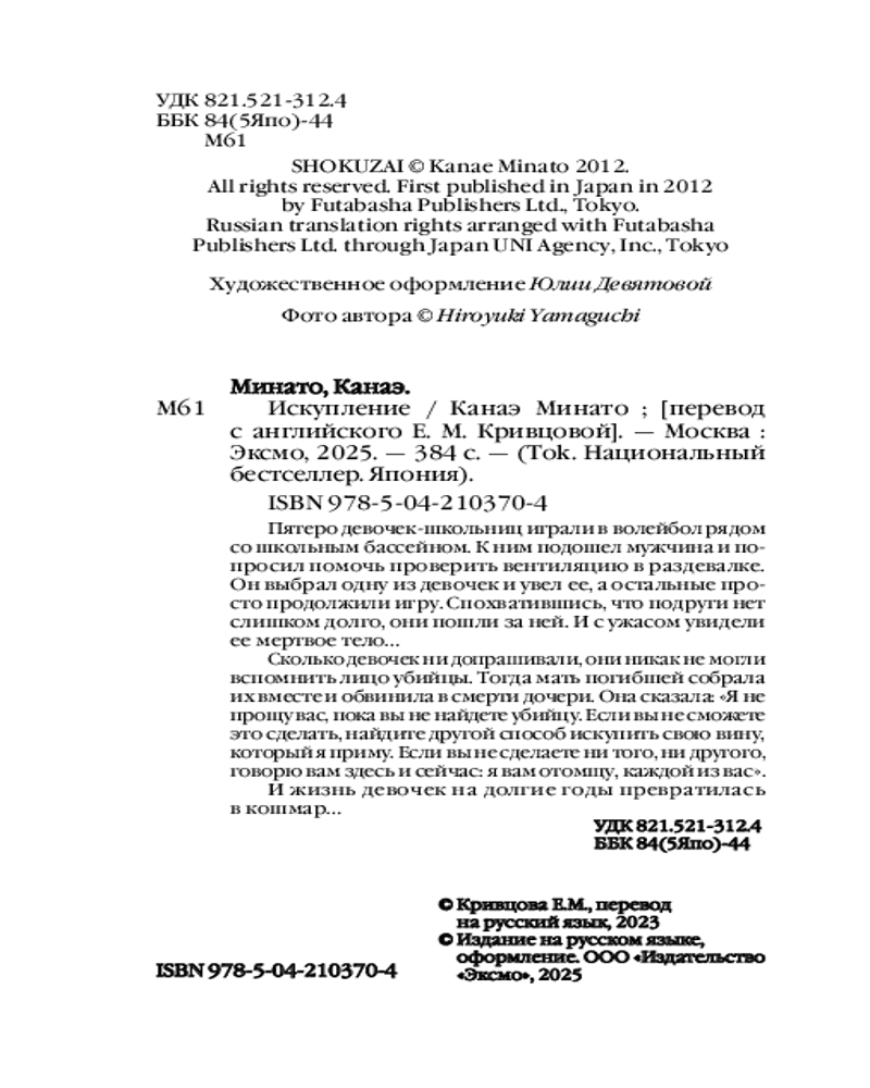 💳 Оплатить за товар можно при получении 🇰🇿 Есть бесплатная доставка по Казахстану от 1 дня 🎁 Копите бонусы с каждой покупки Серия: Tok. Национальный бестселлер. Япония (обложка) Пятеро девочек-школьниц играли в волейбол рядом со школьным бассейном. К ним подошел мужчина и попросил помочь проверить вентиляцию в раздевалке. Он выбрал одну из девочек и увел ее, а остальные просто продолжили игру. Спохватившись, что подруги нет слишком долго, они пошли за ней. И с ужасом увидели ее мертвое тело... Сколько девочек ни допрашивали, они никак не могли вспомнить лицо убийцы. Тогда мать погибшей собрала их вместе и обвинила в смерти дочери. Она сказала: «Я не прощу вас, пока вы не найдете убийцу. Если вы не сможете это сделать, найдите другой способ искупить свою вину, который я приму. Если вы не сделаете ни того, ни другого, говорю вам здесь и сейчас: я вам отомщу, каждой из вас». И жизнь девочек на долгие годы превратилась в кошмар... |