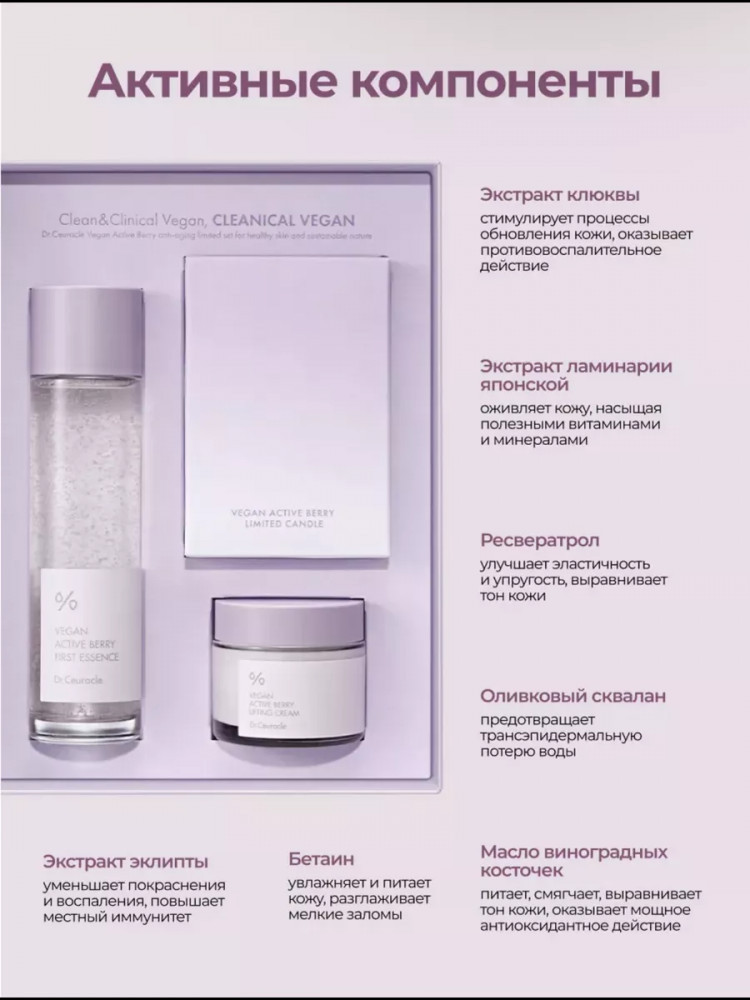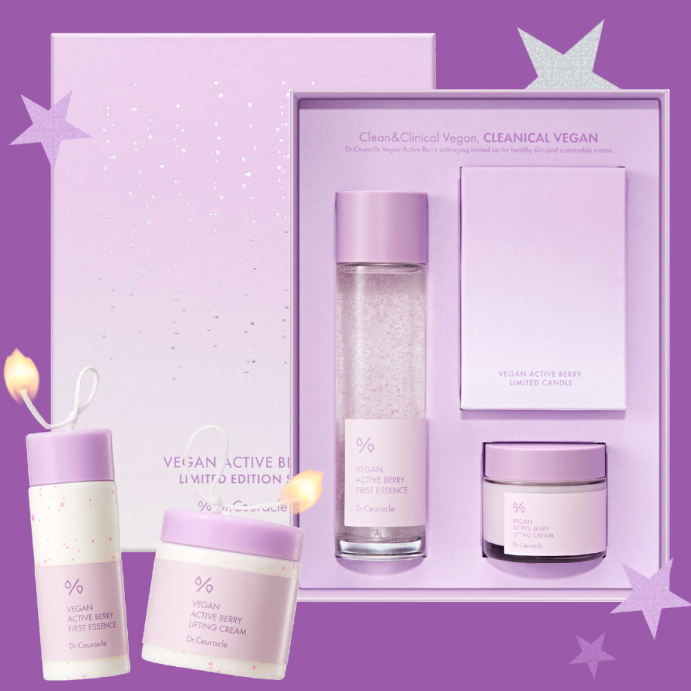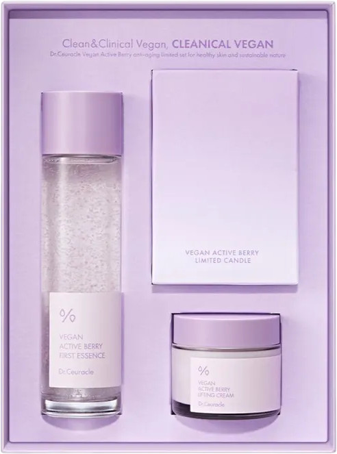 Vegan Active Berry First Essence: water, glycerin, 1,2-hexanediol, methylpropanediol, glycereth-26, centella asiatica extract, ficus carica (fig) fruit extract, laminaria japonica extract, eclipta prostrata leaf extract, vaccinium macrocarpon (cranberry) fruit extract(230ppm), eclipta prostrata extract, melia azadirachta leaf extract, hydrogenated lecithin, sodium hyaluronate, vitis vinifera (grape) seed oil, olea europaea (olive) fruit oil,pelargonium graveolens flower oil, lavandula angustifolia (lavender) oil, anthemis nobilis flower oil, citrus aurantium dulcis (orange) peel oil, juniperus mexicana oil,diglycerin, isononyl isononanoate, octyldodeceth-16, carbomer, tromethamine, adenosine, disodium edta, fructooligosaccharides, butylene glycol, cyamopsis tetragonoloba (guar) gum, agar, beta-glucan, betaine, hydrolyzed hyaluronic acid, ceramide np, xanthan gum, titanium dioxide,moringa oleifera seed oil, resveratrol, collagen, leuconostoc/radish root ferment filtrate, squalane, triethoxycaprylylsilane, aluminum hydroxide, hydroxyacetophenone, ethylhexylglycerin, caprylyl glycol.