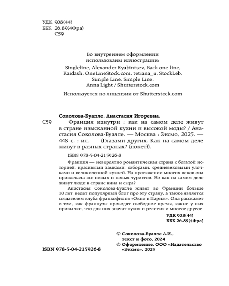 💳 Оплатить за товар можно при получении 🇰🇿 Есть бесплатная доставка по Казахстану 🎁 Копите бонусы с каждой покупки Серия: Глазами других. Как на самом деле живут в разных странах? (покет) Серия «Глазами других» теперь в удобном мини-формате! Книга «Франция изнутри» посвящена всем, кто влюблен в страну шарма и легкости и хочет узнать все о быте и нраве французов. Анастасия Соколова-Буалле, гид и историк из Парижа, станет для вас личным проводником и поможет разобраться во всех тонкостях французской культуры. А еще в книге вас ждут 3 традиционных рецепта французской кухни! А также найдете тест, который определит, насколько в душе вы парижанин! |