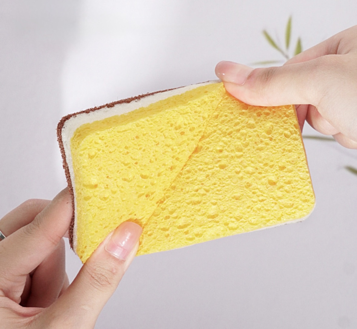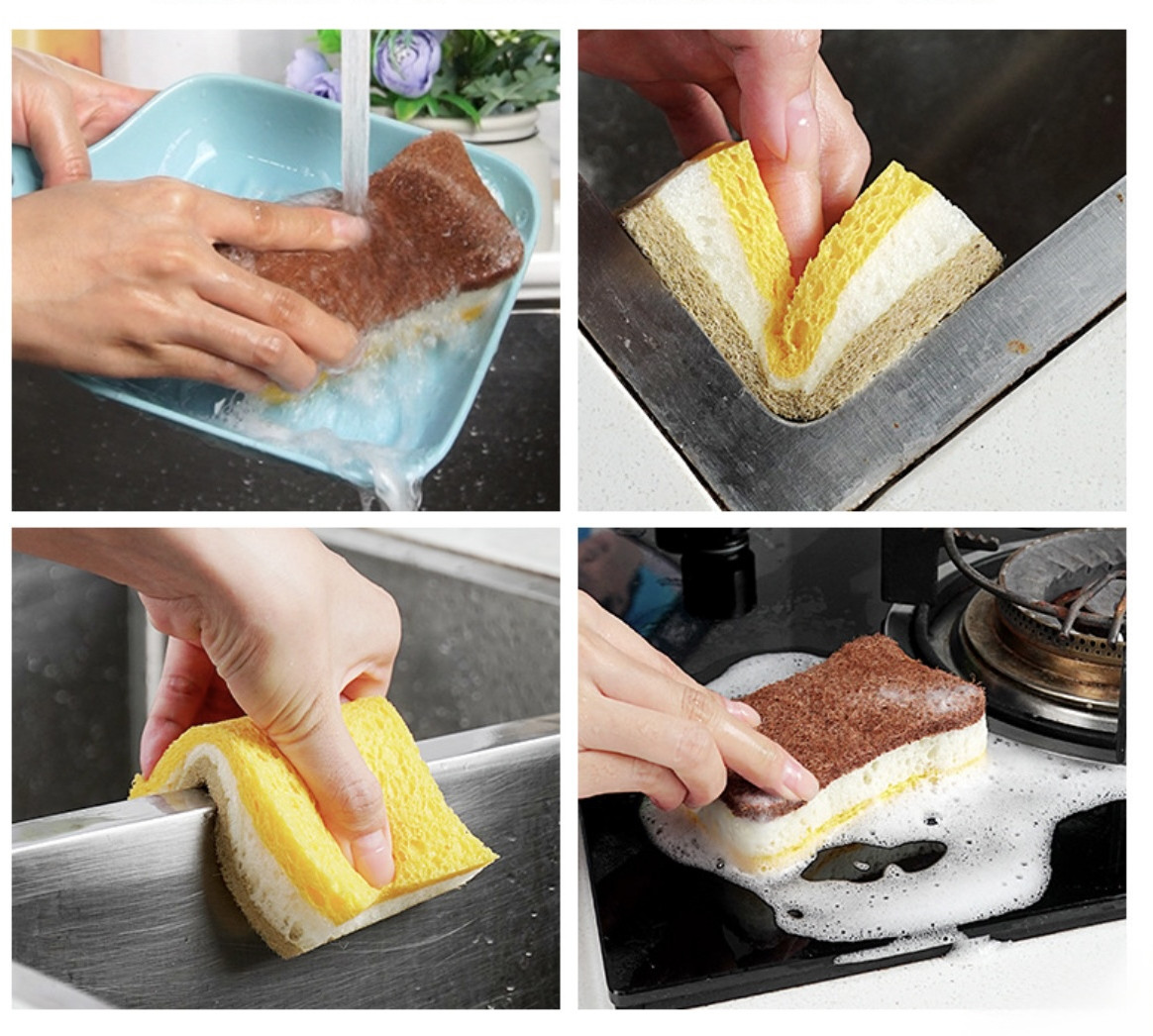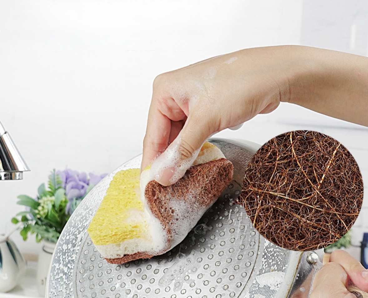• двусторонняя структура для разного типа загрязнений: желтая сторона (мягкая) — бережно очищает стеклянную и керамическую посуду, не оставляя царапин; коричневая сторона (абразивная) — выполнена из прочных натуральных волокон (например, кокосовых или древесных), эффективно удаляет пригоревшие остатки пищи, жир и сложные загрязнения;
