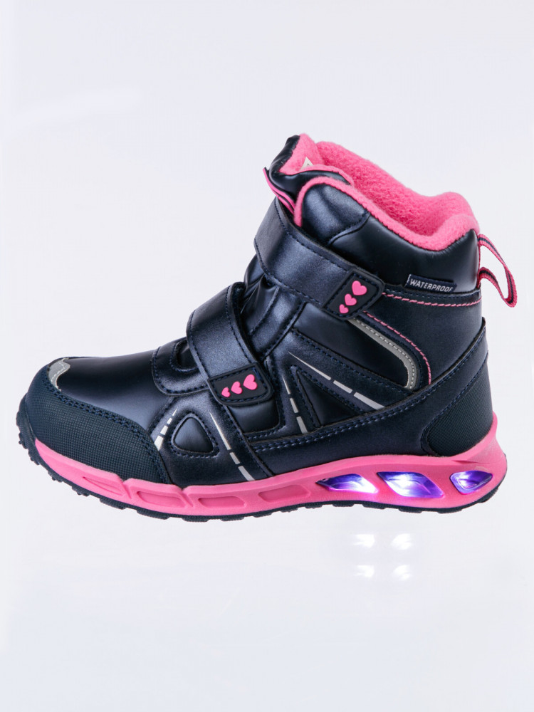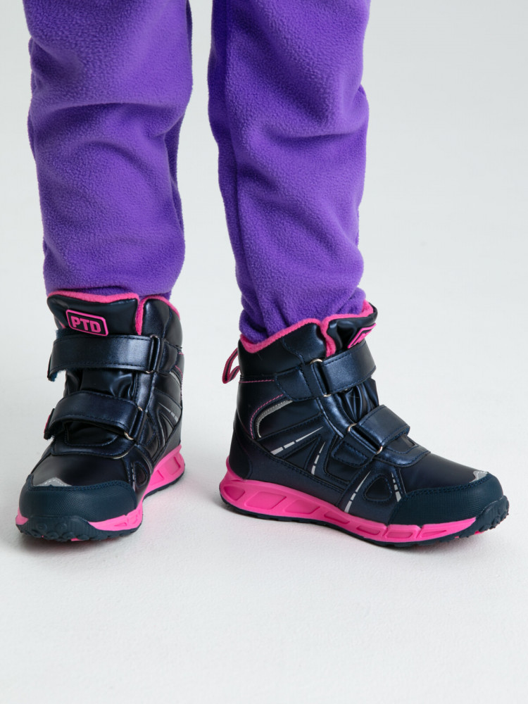 Конструкция верха изготовлена с использованием мембранных технологий. Усиленная защита носка и пятки специальными материалами. Подкладка и стелька выполнены из шерстяного меха 80%. Трехслойная стелька с фольгой, которая обеспечивает сохранение тепла в течение длительного времени. Формоустойчивый задник поддерживает стопу в правильном положении. Подошва имеет противоскользящий протектор. Удобная застежка-липучка. Модель со светодиодной подсветкой позволяет хорошо видеть ребенка даже в темное время суток. Рекомендованный температурный режим от 0°С до -20°С.
