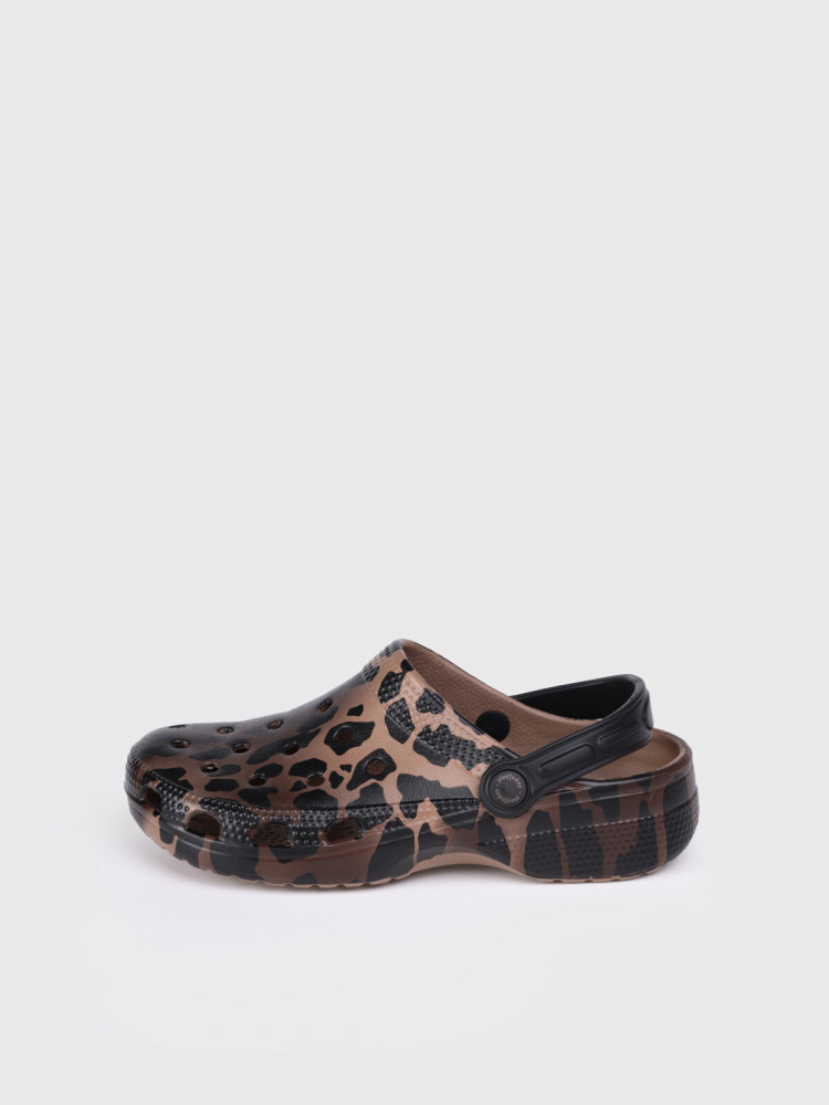 Трендовые сабо для девочки подростка из облегченного и прочного ЭВА. Материал хорошо моется. Модель запринтована рисунком леопард. Форма модели учитывает эргономику стопы. Модель имеет перекидной ремешок для лучшей фиксации обуви на ноге.