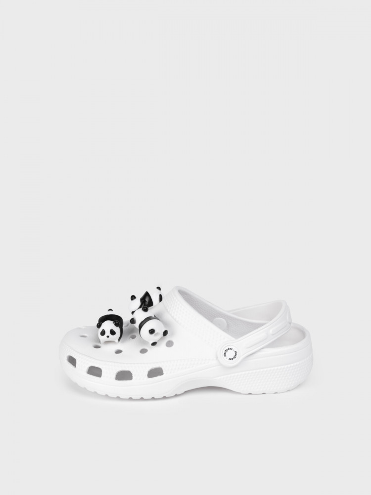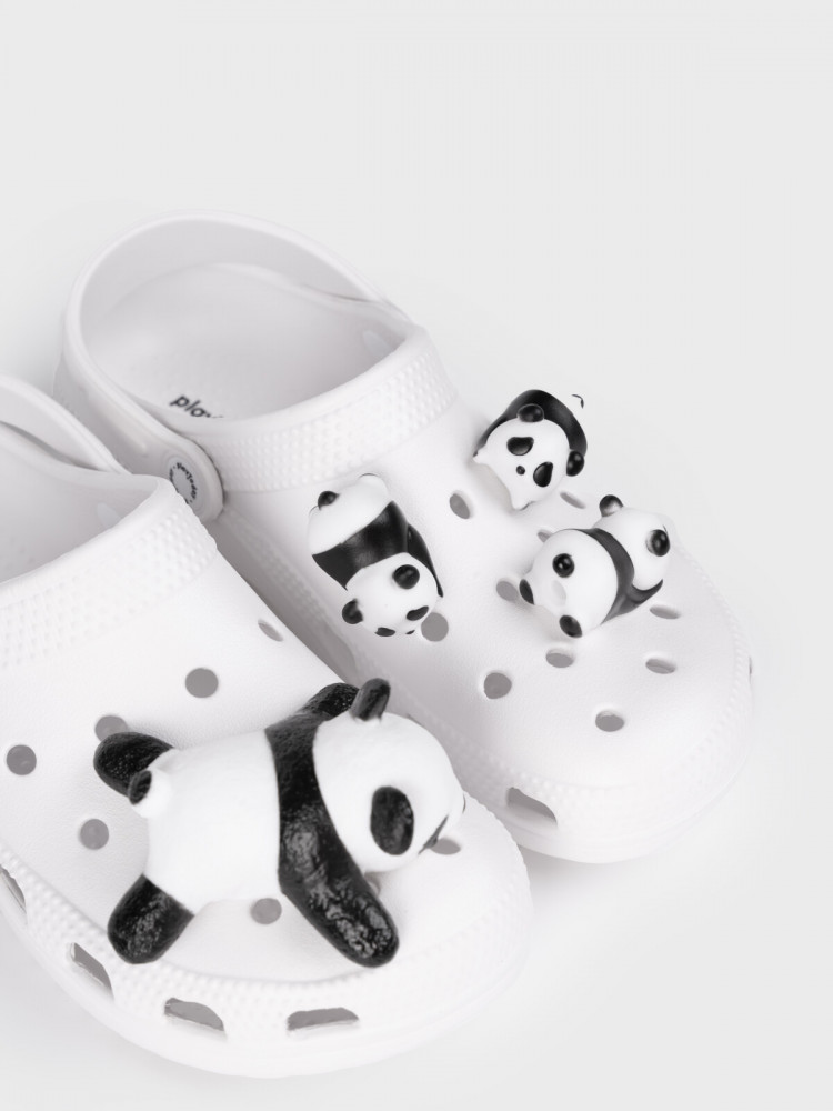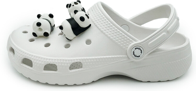 Трендовые сабо для девочки подростка в черно-белой гамме с джибицами-пандами. Шлепанцы выполнены из облегченного и прочного ЭВА. Материал хорошо моется. Форма модели учитывает эргономику стопы. Модель имеет перекидной ремешок для лучшей фиксации обуви на ноге.