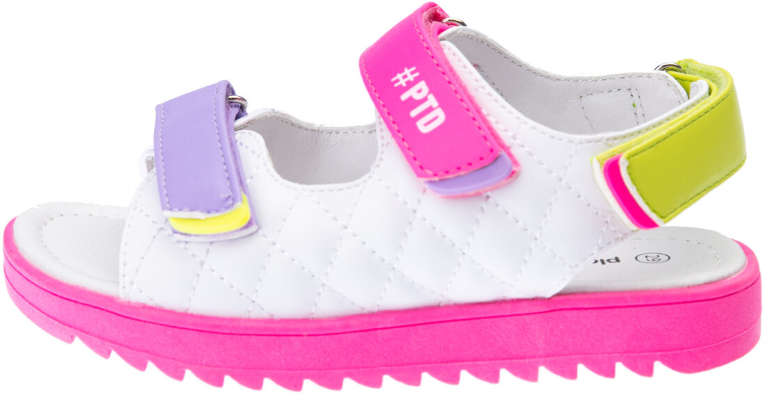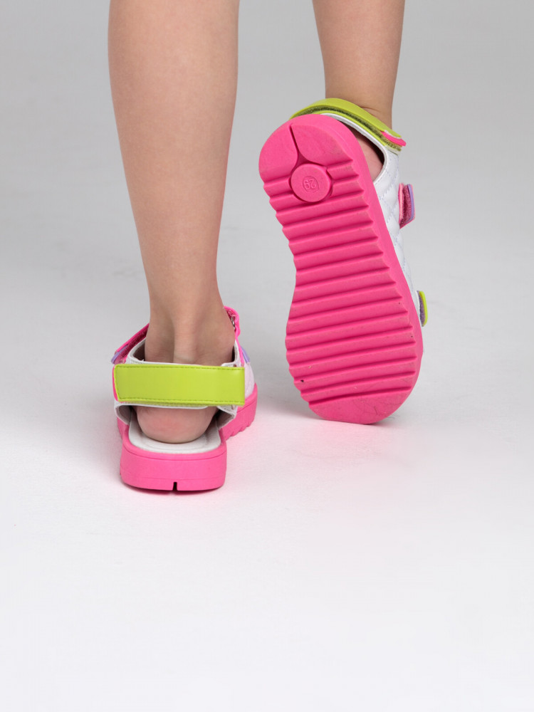 Сандалии из искусственной кожи. Облегченная подошва с противоскользящим протектором. Подкладка из натуральной кожи. Стелька из натуральной кожи с анатомическим элементом поддерживает свод стопы в правильном положении. Удобная застежка-липучка.