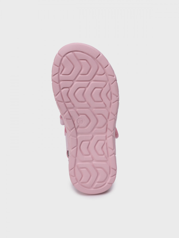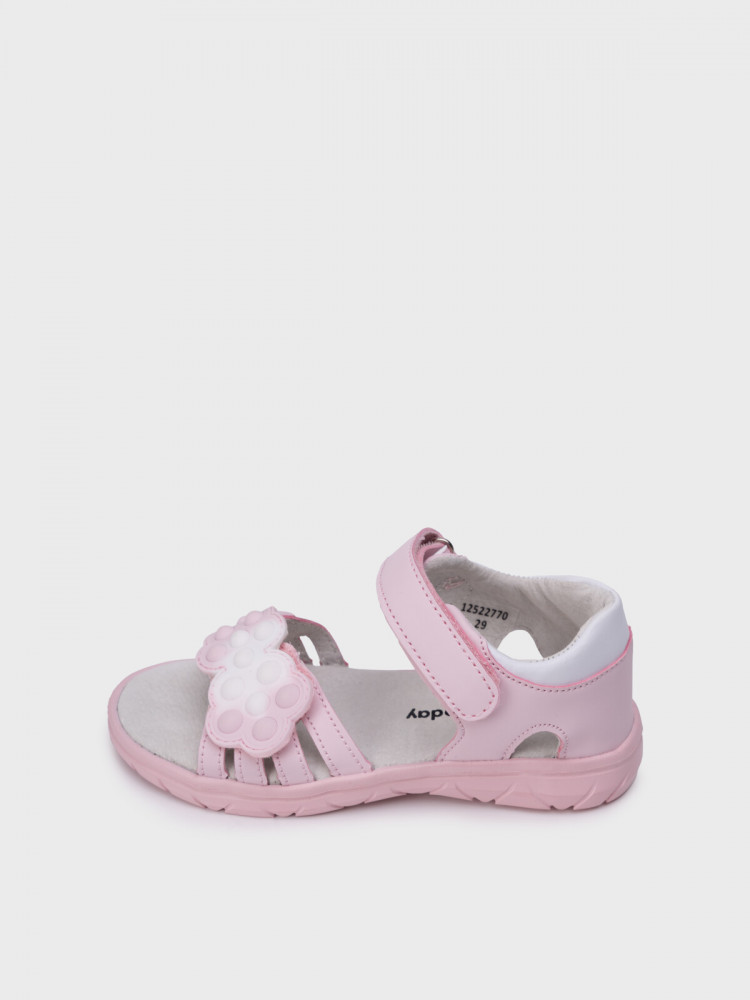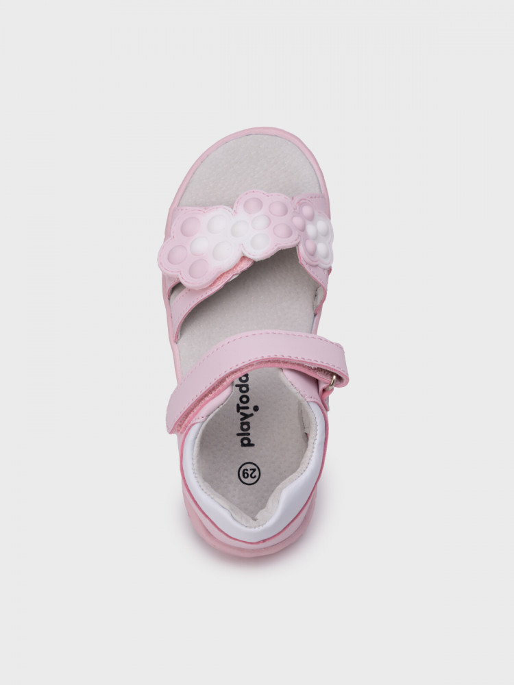 Розовые детские сандалии для девочки с закрытой пяткой. Босоножки выполнены из искусственной кожи, обладающей высокими износостойкими свойствами. Удобные ремни с липучками позволяют регулировать обувь на любой подъем. Передний ремень выполнен из градиентной ПВХ детали в стиле POP IT. Подкладка и стелька выполнена из свиной кожи. Модель имеет гибкую и легкую подошва из ЭВА с противоскользящим протектором.