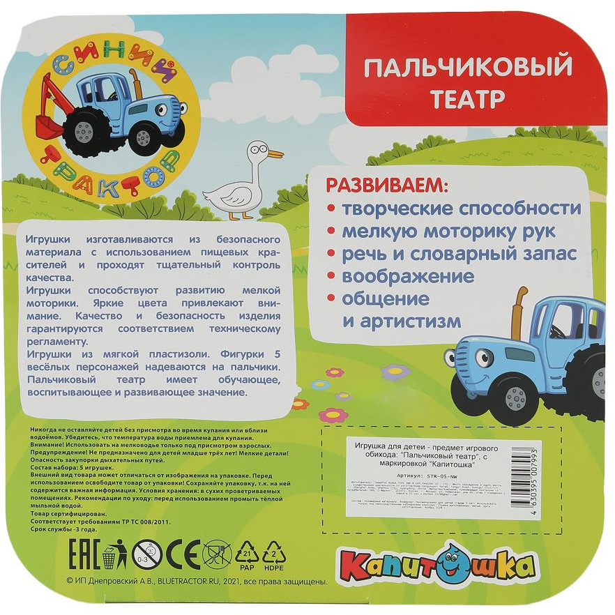 Капитошка Набор игрушек для ванныВ данный момент этот товар отсутствует в продаже. Возможно, у нас найдется аналогичный или похожий товар здесь. Серия: Синий трактор Игрушка из пластизоля для ванны — пальчиковый театр «Синий Трактор» ТМ «Капитошка» — отличный подарок для маленьких поклонников одноимённого мультсериала. Ребёнок с удовольствием будет играть с яркими фигурками героев популярного мультфильма и устраивать с ними пальчиковые театральные представления. Родители также могут принимать активное участие в таких постановках — фигурки подходят как для детских, так и для взрослых пальцев. Красочная расцветка и детальная проработка фигурок привлекут внимание малыша и сделают игру весёлой и интересной. Игрушки изготавливаются из безопасного материала с использованием пищевых красителей и проходят тщательный контроль качества. Игры в пальчиковый театр ТМ «Капитошка» развивают: творческие способности, воображение, внимание, мелкую моторику рук, общение, артистизм, речь и словарный запас. |
