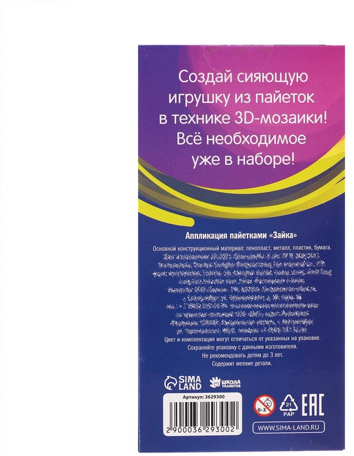 Школа талантов Игрушка пайетками «Зайка»В данный момент этот товар отсутствует в продаже. Возможно, у нас найдется аналогичный или похожий товар здесь. Создайте сверкающую игрушку своими руками! Набор позволит ребёнку смастерить сверкающую игрушку. Малыш с интересом создаст шедевр из ярких пайеток. Ему понравится не только результат работы, но и сам творческий процесс. Увлекательное занятие поможет развить мелкую моторику рук, усидчивость, внимательность и аккуратность. В набор входит: основа из пенопласта, гвоздики, мерцающие пайетки. Наслаждайтесь счастливыми моментами творчества вместе с детьми! |