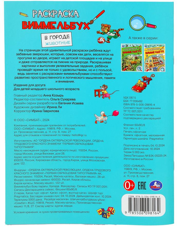 💳 Оплатить за товар можно при получении 🇰🇿 Есть бесплатная доставка по Казахстану от 1 дня 🎁 Копите бонусы с каждой покупки Серия: Найди и раскрась Раскраска-виммельбух «В городе. Животные» из серии «Найди и раскрась» ТМ «УМка» непременно понравится маленьким любознайкам. На страницах этой удивительной раскраски ребёнка ждёт знакомство с окружающим миром и путешествие по интересным местам. Раскрашивая картинки и выполняя увлекательные задания, дети проведут время не только с удовольствием, но и с пользой, ведь занятия с раскраской-виммельбухом способствуют развитию пространственного и логического мышления, памяти и внимания. |
