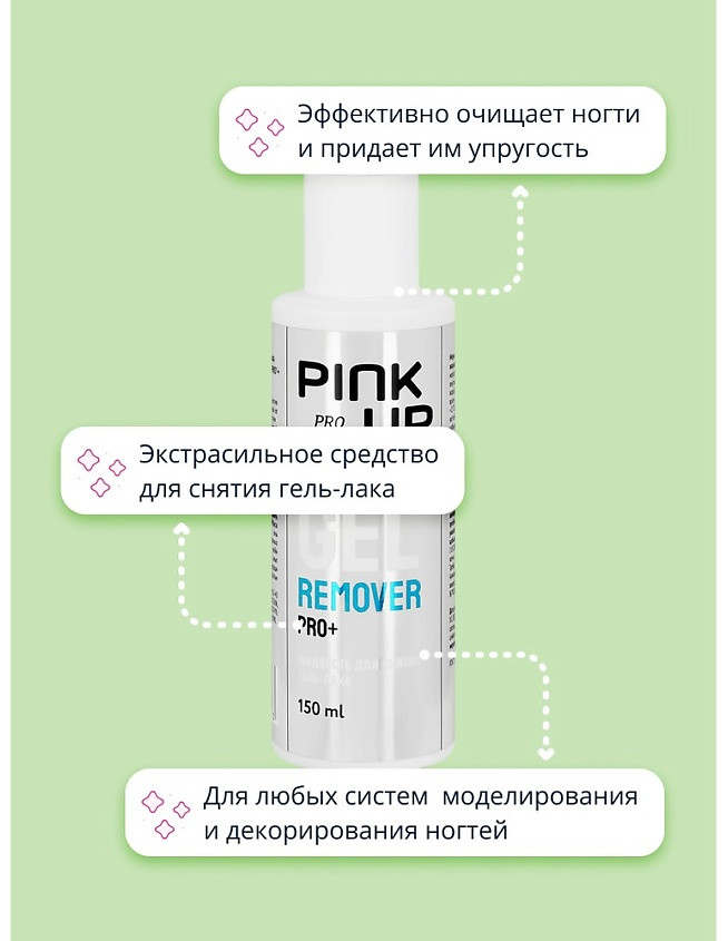 Экстрасильное средство для снятия гель-лака, акрила и искусственных ногтей от Pink Up Pro. Подходит для любых систем моделирования и декорирования ногтей. Средство смягчает действие активных компонентов, эффективно очищает ногти и придает им упругость.
