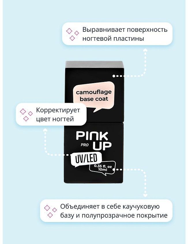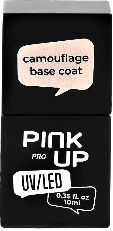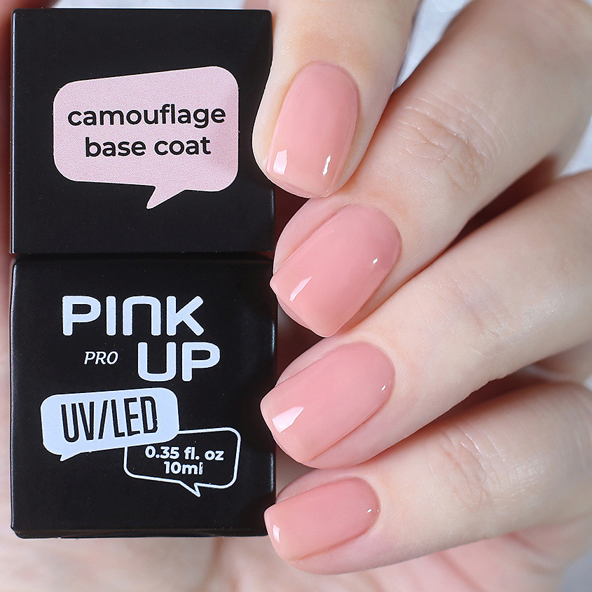 Камуфлирующая база для ногтей UV/LED Pink Up PRO Camouflage Base Coat объединяет в себе каучуковую базу и полупрозрачное покрытие натурального цвета. База выравнивает поверхность ногтевой пластины, корректирует цвет ногтей.
