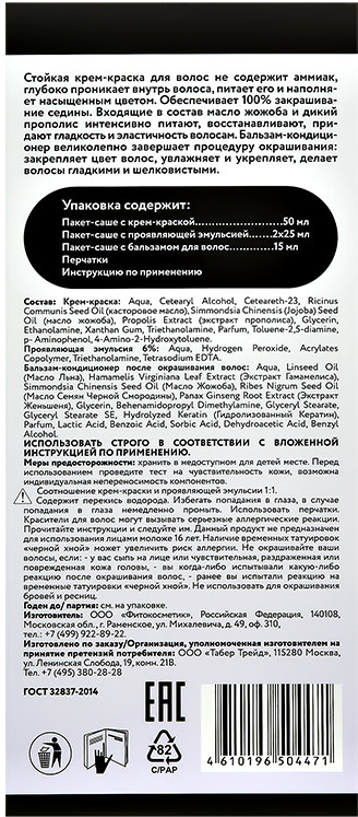 Крем-краска: Aqua, Cetearyl Alcohol, Ceteareth-23, Ricinus Communis Seed Oil (касторовое масло), Simmondsia Chinensis (Jojoba) Seed Oil (масло жожоба), Propolis Extract (экстракт прополиса), Glycerin, Ethanolamine, Xanthan Gum, Triethanolamine, Parfum, Toluene-2,5-diamine, p- Aminophenol, 4-Amino-2-Hydroxytoluene.
