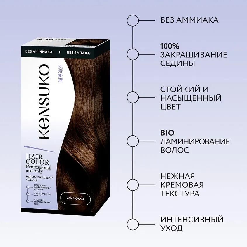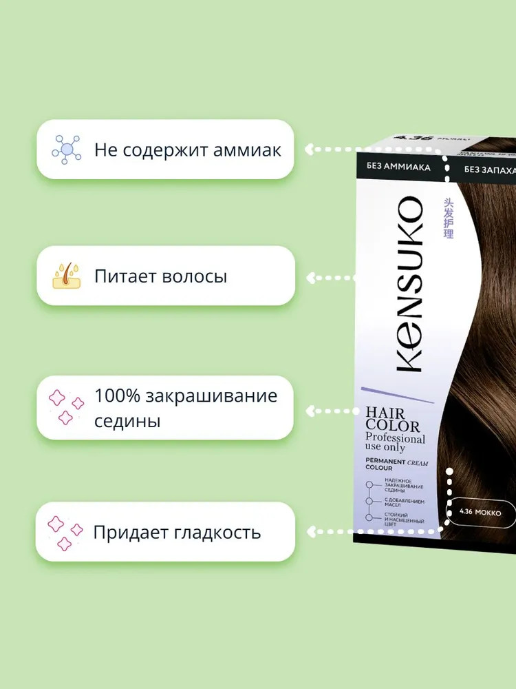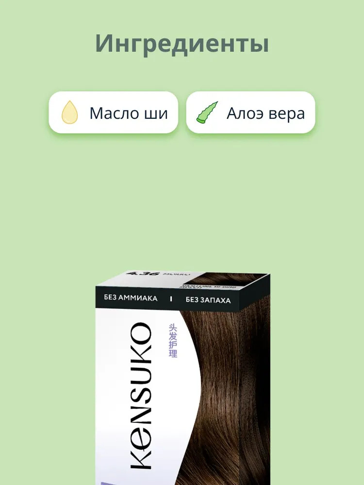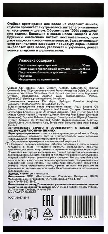 Крем-краска: Aqua, Cetearyl Alcohol, Ceteareth-23, Ricinus Communis Seed Oil (касторовое масло), Prunus Amygdalus Dulcis Oil (масло миндаля), Vaccinium Vitis-idaea Fruit Extract (экстракт ягод брусники), Glycerin, Ethanolamine, Xanthan Gum, Triethanolamine, Parfum, Toluene-2,5-diamine, p- aminophenol, 1-naphthol.