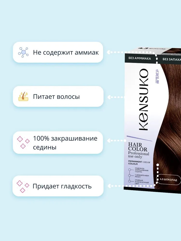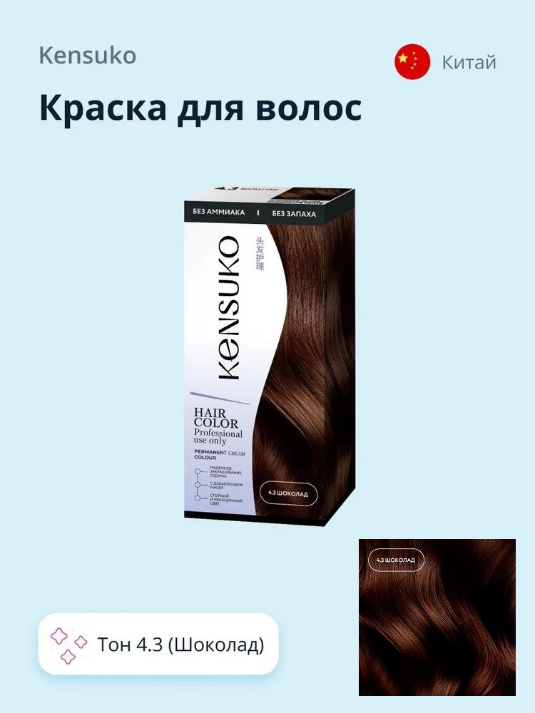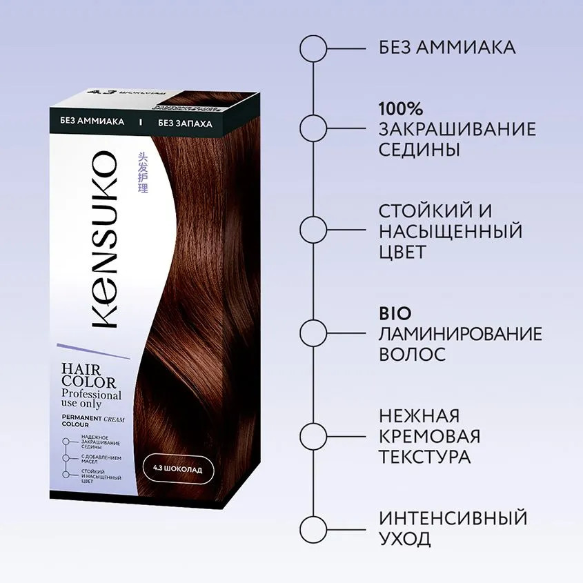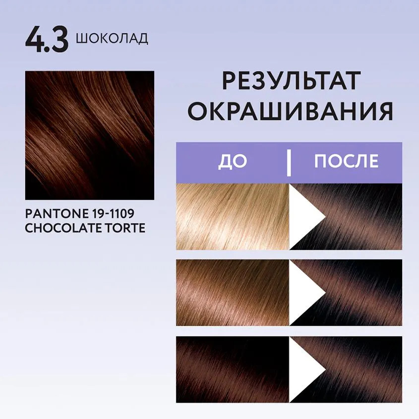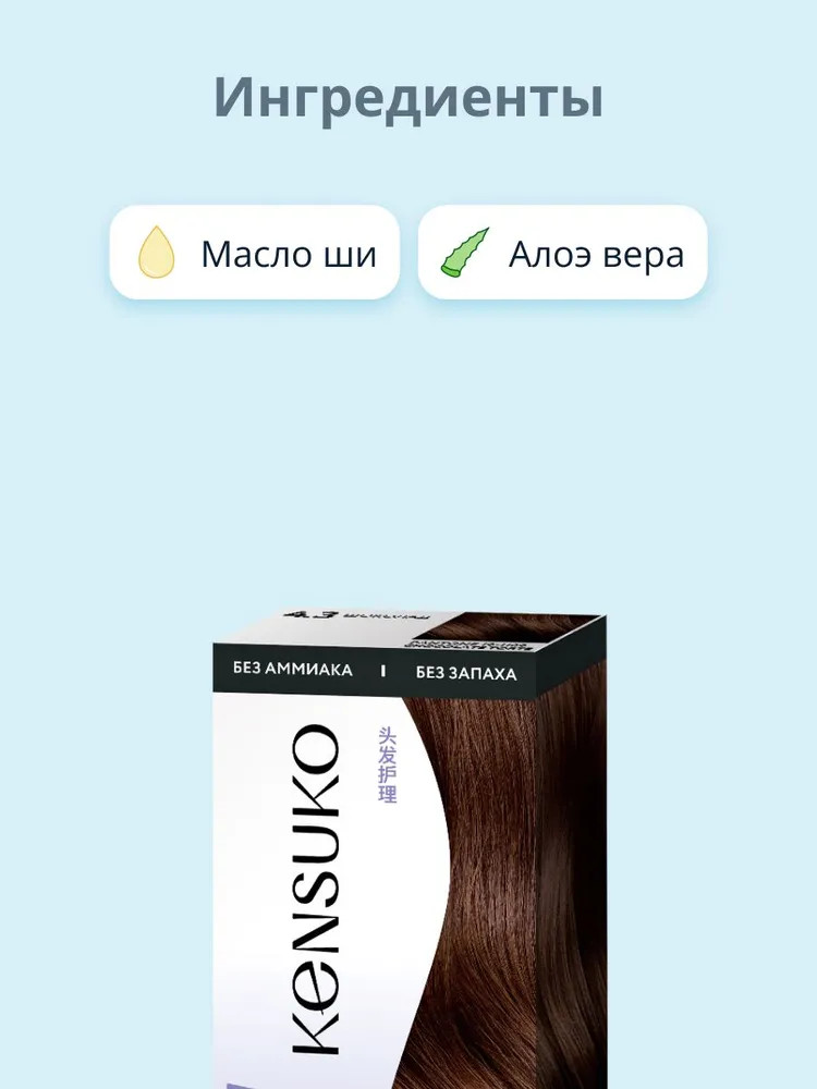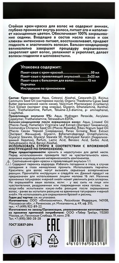 Крем-краска: Aqua, Cetearyl Alcohol, Ceteareth-23, Ricinus Communis Seed Oil (касторовое масло), Organic Theobroma Cacao Seed Butter (органическое масло какао), Vaccinium Macrocarpon (Cranberry) Fruit Extract (экстракт ягод клюквы), Glycerin, Ethanolamine, Xanthan Gum, Triethanolamine, Parfum, Toluene-2,5-diamine, p- aminophenol, 1-naphthol.