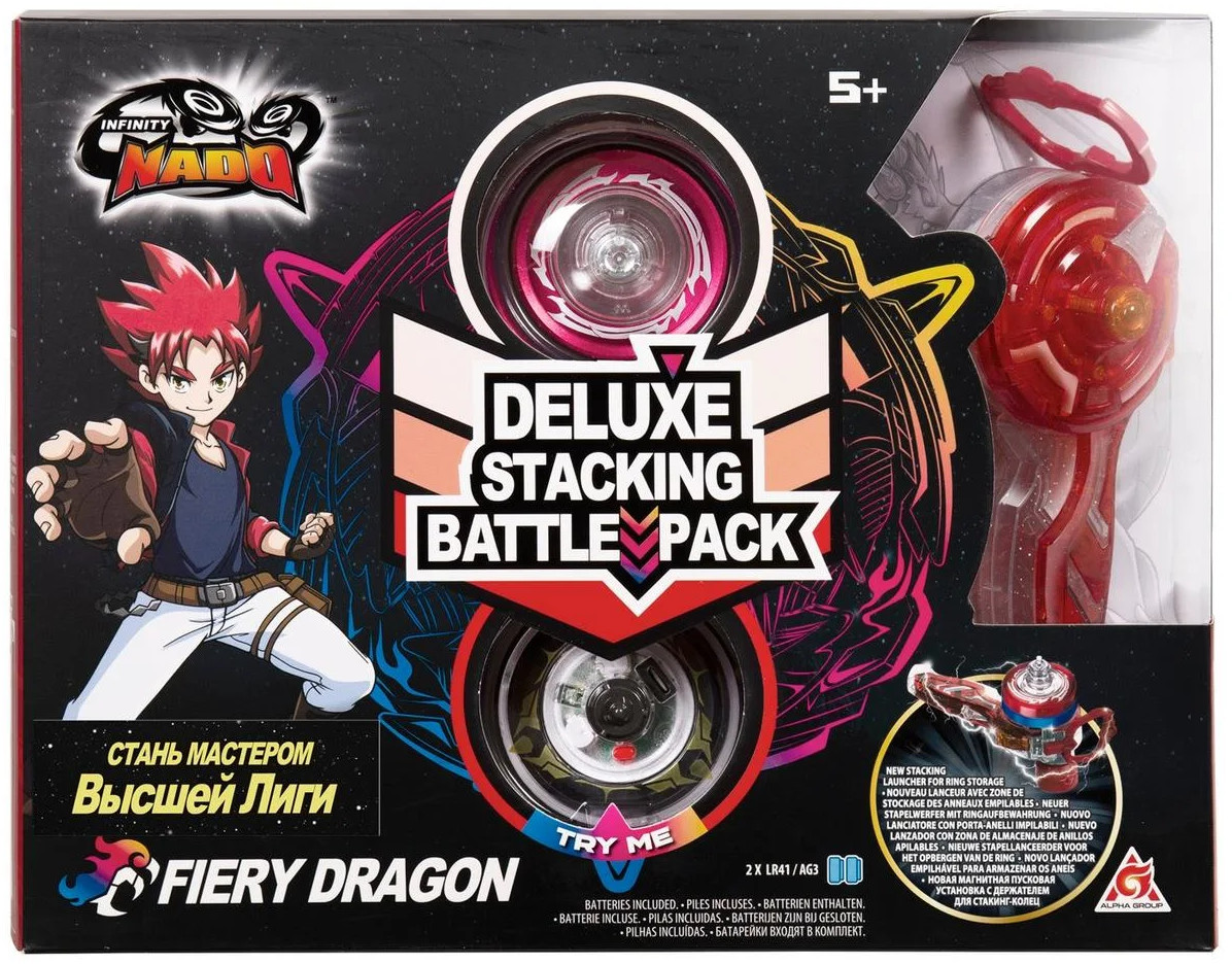 Еще более мощные блейд-баттлы с линейкой Стакинг! Собери самый высокий волчок и атакуй противника невероятной башней Надо. Докажи, что ты достоин звания Мастера Высшей Лиги! Бери выше! Запускай стакинг-кольца на стакинг-волчок, активируй световой режим дополнительной мощности — устрой красочный блейд-баттл! Используй волчок серии СтакингДелюкс с кольцами из набора 3-в-1 и с другими наборами серии Стакинг для создания самого высокого и эпичного волчка Инфинити Надо. Новая магнитная пусковая установка с держателем для колец позволяет коллекционировать стакинг-кольца и максимально быстро запускать их на стакинг-волчок во время баттла.