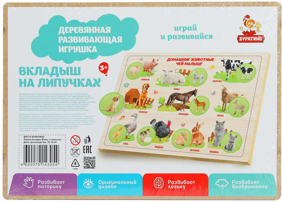 Буратино Рамка-вкладыш на липучках «Домашние животные. Чей малыш?»В данный момент этот товар отсутствует в продаже. Возможно, у нас найдется аналогичный или похожий товар здесь. Деревянная рамка-вкладыш на липучках «Домашние животные. Чей малыш?» ТМ «Буратино» — отличная развивающая игра для маленьких любознаек. Вкладыши представляют собой игровое поле с домашними животному. Каждому животному соответствует малыш. В процессе игры ребёнок интуитивно или с помощью взрослого находит предназначенное место для каждой детали. Игра с вкладышами ТМ «Буратино» будет способствовать развитию у детей: мелкой моторики, логического мышления, внимания и памяти. |