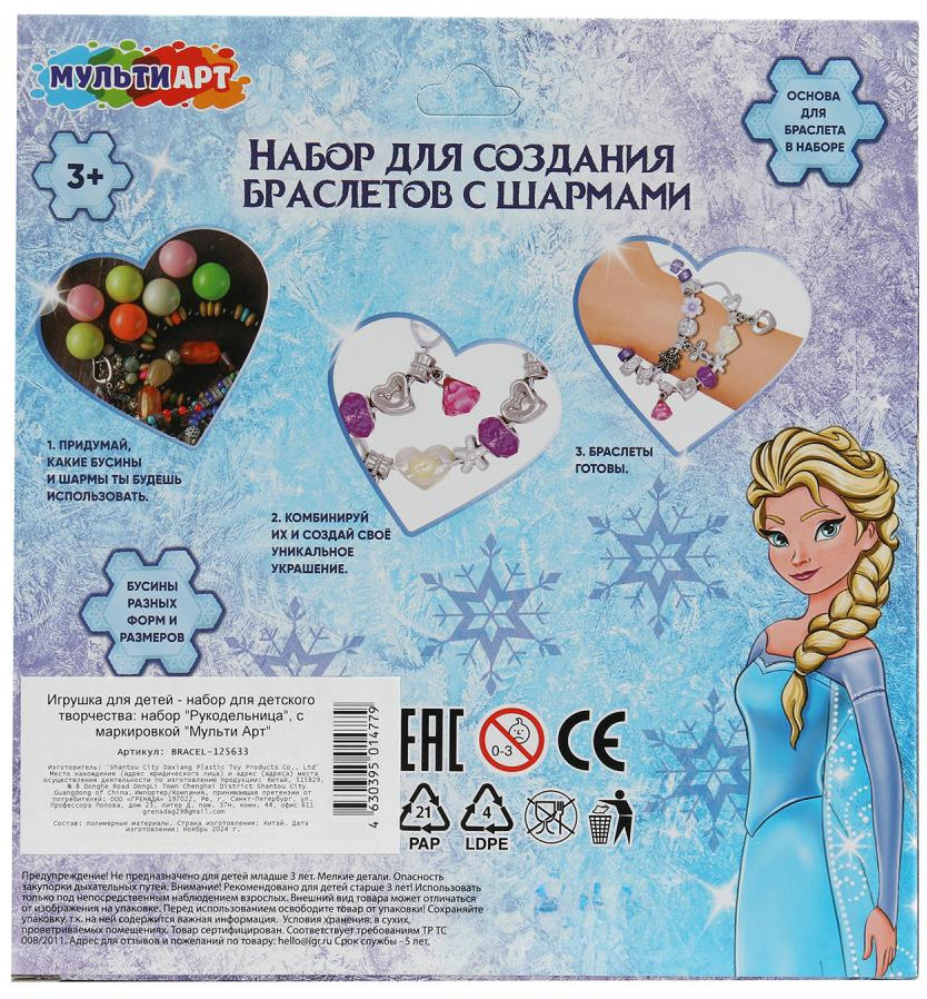 💳 Оплатить за товар можно при получении 🇰🇿 Есть бесплатная доставка по Казахстану от 1 дня 🎁 Копите бонусы с каждой покупки Набор для создания браслетов с шармами «Снежная принцесса» ТМ «Мульти Арт» — отличный подарок для маленьких модниц: |