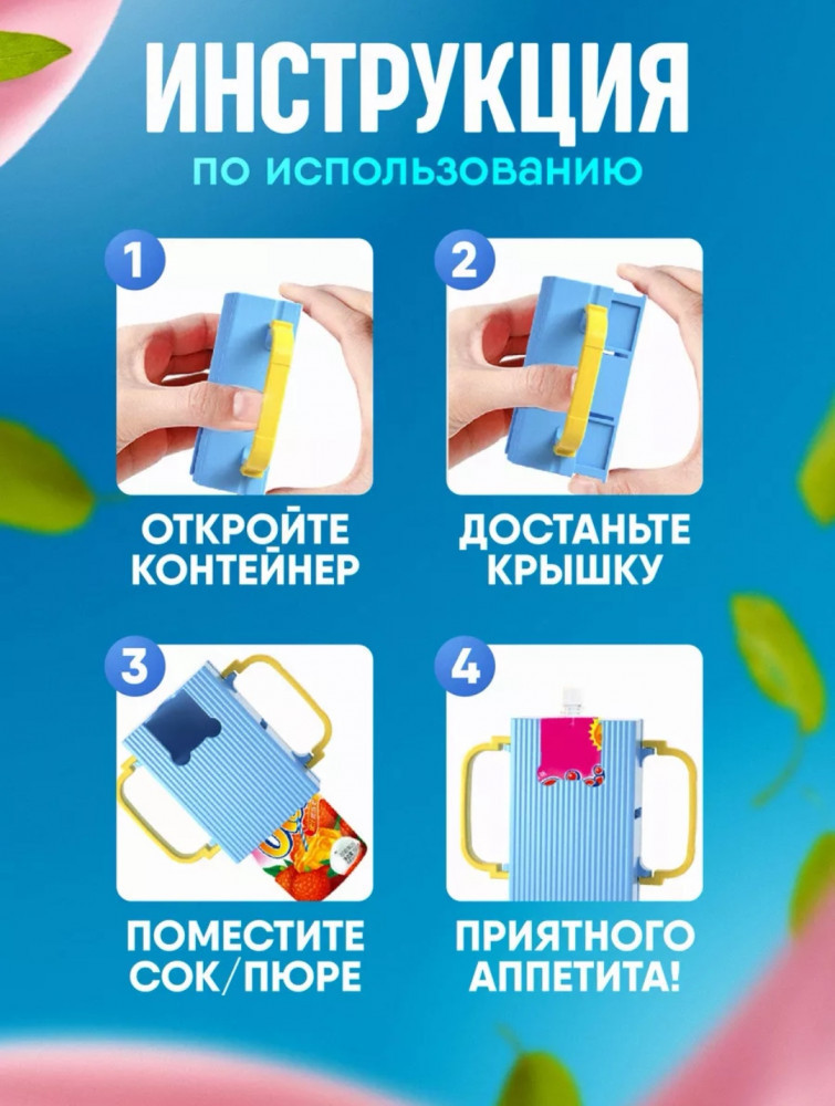 Подобный чехол способствует развитию навыков самостоятельного принятия пищи у малыша. Контейнер для детского пюре и сока изготовлен из прочного и лёгкого материала, который просто моется и долго сохраняет свои качества. Он универсального размера и подходит для большинства стандартных пакетов с пюре и соком.