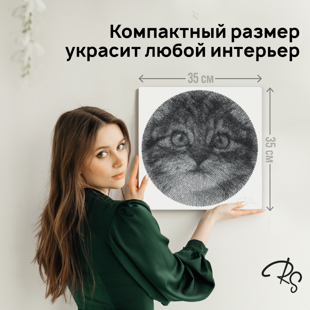 Основа картины нитью — 35×35 см, диаметр готовой картины — 32 см, 200 гвоздей по кругу. Сохрани самые ценные воспоминания с RingString! |