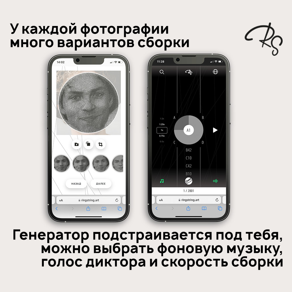 Онлайн-генератор на сайте предлагает несколько вариантов сборки картины по фотографии — ты можешь выбрать тот, который понравится больше всего. Выбери медитацию или звуки природы во время сборки, чтобы почувствовать расслабление и наслаждение процессом. Коробка RingString Mini превращается в мольберт, чтобы тебе было удобно собирать картину по фото нитью в любом месте без дополнительных приспособлений.