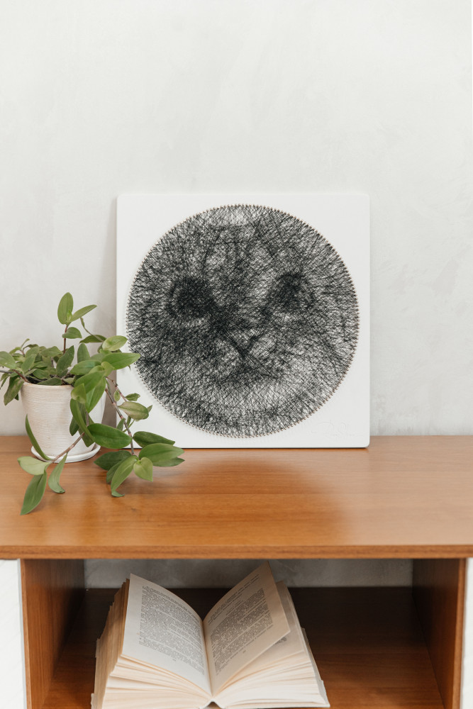 Готовой картиной можно украсить дизайн спальни, гостиной или детской. В наборе есть крепление, с помощью которого можно легко повесить картину на стену. Картина создается непрерывной мононитью, вырисовывая детали фотографии шаг за шагом. Лаконичный и компактный черно-белый портрет впишется в любой интерьер и станет стильной изюминкой. Создай оригинальную композицию с помощью картин разных размеров!