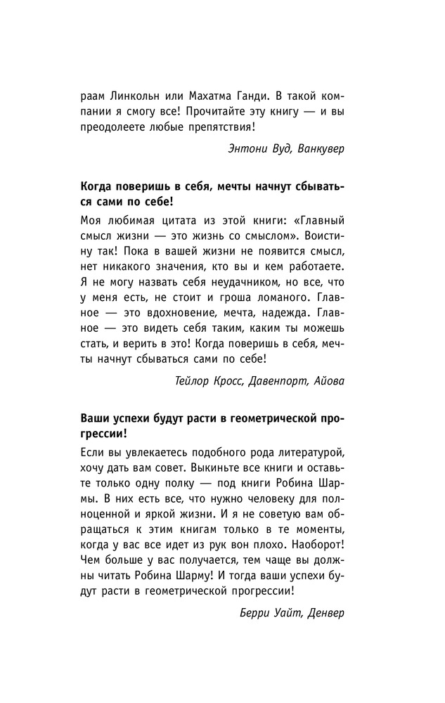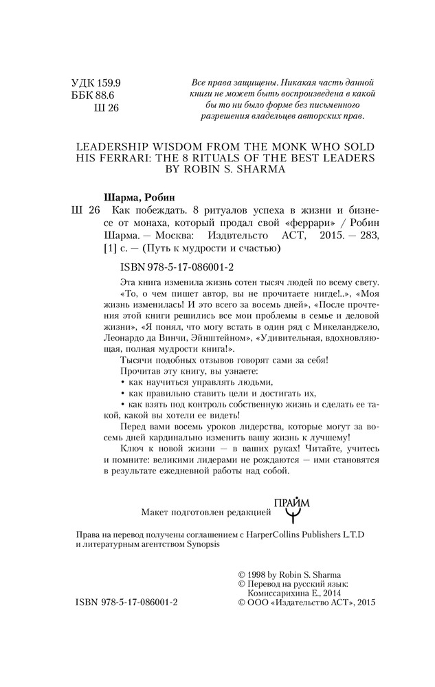 Как побеждать. 8 ритуалов успеха в жизни и бизнесе от монаха, который продал свой "феррари"В данный момент этот товар отсутствует в продаже. Возможно, у нас найдется аналогичный или похожий товар здесь. Серия: Путь к мудрости и счастью Эта книга изменила жизнь сотен тысяч людей по всему свету. «То, о чем пишет автор, вы не прочитаете нигде!..», «Моя жизнь изменилась! И это всего за восемь дней», «После прочтения этой книги решились все мои проблемы в семье и деловой жизни», «Я понял, что могу встать в один ряд с Микеланджело, Леонардо да Винчи, Эйнштейном», «Удивительная, вдохновляющая, полная мудрости книга!». Тысячи подобных отзывов говорят сами за себя! Прочитав эту книгу, вы узнаете: как научиться управлять людьми, как правильно ставить цели и достигать их, как взять под контроль собственную жизнь и сделать ее такой, какой вы хотели ее видеть! Перед вами восемь уроков лидерства, которые могут за восемь дней кардинально изменить вашу жизнь к лучшему! Ключ к новой жизни — в ваших руках! Читайте, учитесь и помните: великими лидерами не рождаются — ими становятся в результате ежедневной работы над собой. |