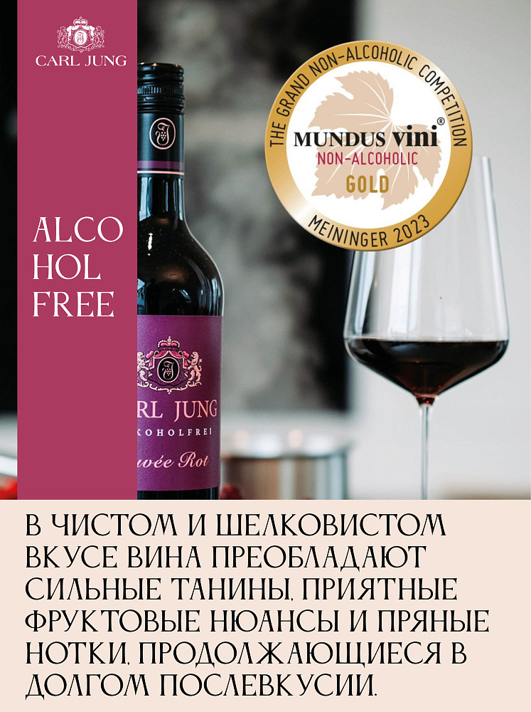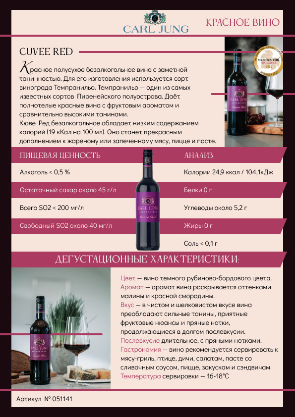 Carl Jung Вино безалкогольное красное полусухое «Cuvee Red»В данный момент этот товар отсутствует в продаже. Возможно, у нас найдется аналогичный или похожий товар здесь. Carl Jung Cuvee Red (Rot) — красное полусухое безалкогольное вино с заметной танинностью. Для его изготовления используется сорт винограда Темпранильо. Темпранильо — один из самых известных сортов Пиренейского полуострова. Даёт полнотелые красные вина с фруктовым ароматом и сравнительно высокими танинами. «Кюве Ред» безалкогольное обладает низким содержанием калорий (19 кКал на 100 мл). Оно станет прекрасным дополнением к жареному или запеченному мясу, пицце и пасте. |