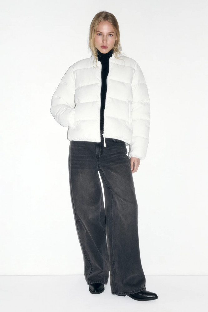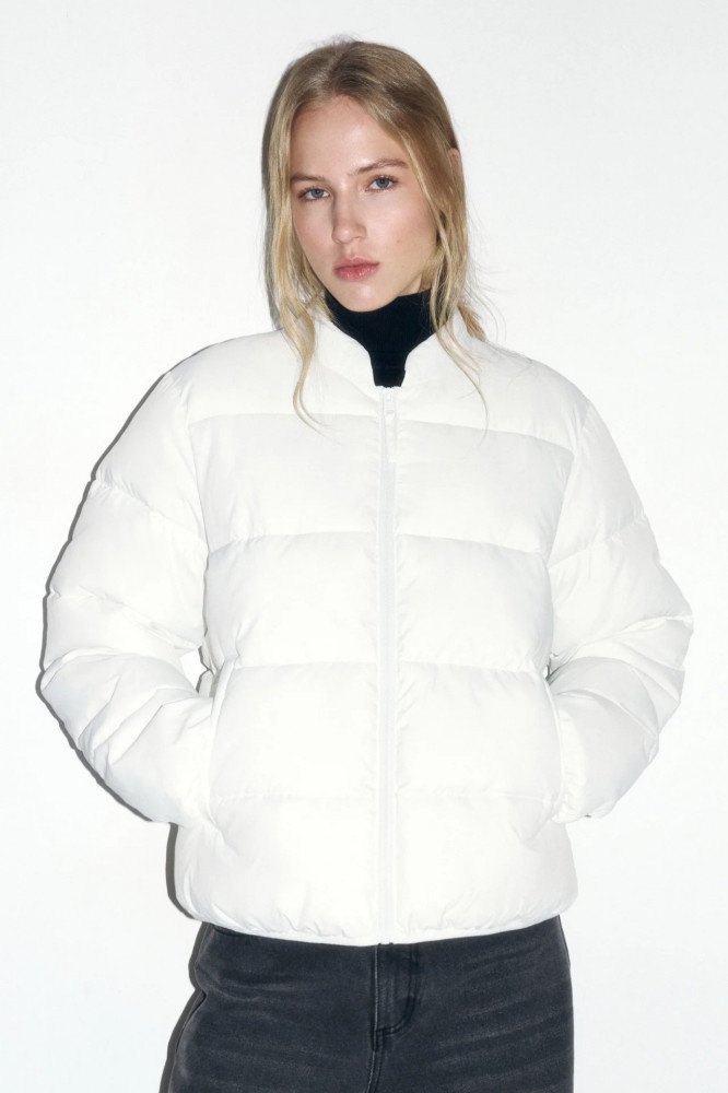 Короткая женская стеганая куртка-бомбер свободного кроя из гладкой ткани с легким искусственным утеплителем. Классический короткий воротник-стойка. Длинные рукава с присборенными манжетами на резинке и спущенной линией плеча. Застежка на молнию по всей длине. Два прорезных боковых кармана без клапана и застежки
