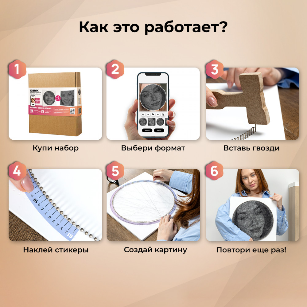 Техника проста и доступна, картина создается путем натяжения нитей на деревянной основе с вбитыми гвоздиками. Следуя инструкции, изготовленной на основе Вашей фотографии, шаг за шагом сотворите то, что останется на память на долгие годы. Занятие подходит для людей всех возрастов, развивает цветовое восприятие, абстрактное и пространственное мышление. Картина станет уникальным подарком для друзей и близких, который украсит дом и добавит акцент в интерьере.