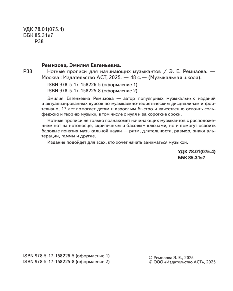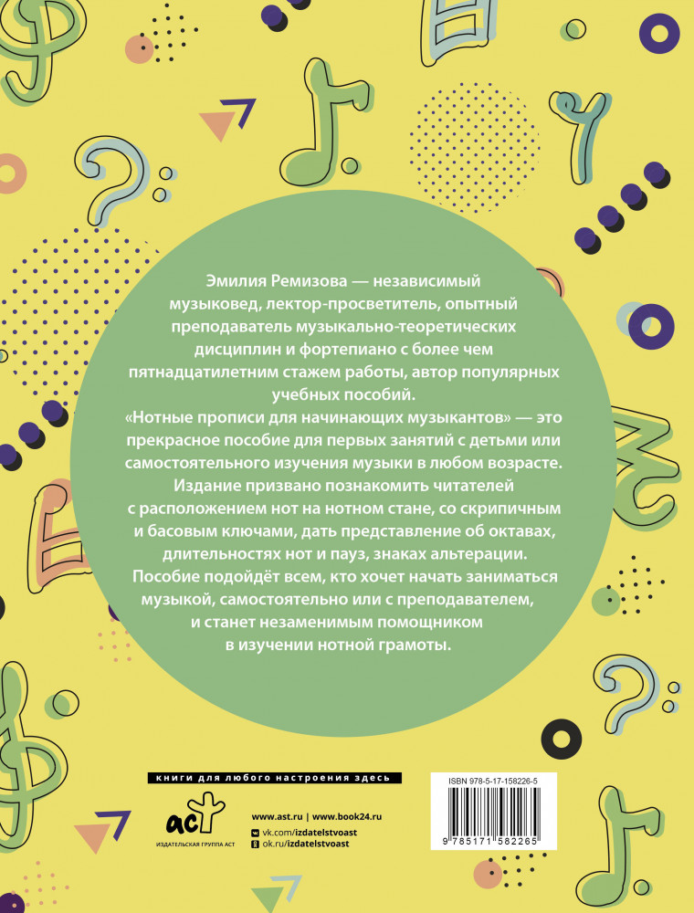 Нотные прописи для начинающих музыкантовВ данный момент этот товар отсутствует в продаже. Возможно, у нас найдется аналогичный или похожий товар здесь. Серия: Музыкальная школа Эмилия Евгеньевна Ремизова — автор популярных музыкальных изданий и актуализированных курсов по музыкально- теоретическим дисциплинам и фортепиано, 17 лет помогает детям и взрослым быстро и качественно освоить сольфеджио и теорию музыки, в том числе с нуля и за короткие сроки. Нотные прописи не только познакомят начинающих музыкантов с расположением нот на нотоносце, скрипичным и басовым ключами, но и помогут освоить базовые понятия музыкальной науки — ритм, длительности, размер, знаки альтерации, гаммы и другие. Издание подойдет для всех, кто хочет начать заниматься музыкой. |