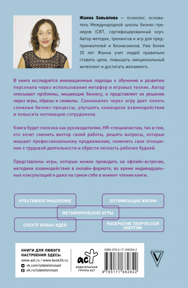 💳 Оплатить за товар можно при получении 🇰🇿 Есть бесплатная доставка по Казахстану от 1 дня 🎁 Копите бонусы с каждой покупки Серия: Алгоритмы успеха Жанна Завьялова — психолог, основатель Международной Школы Бизнес-тренеров ICBT, сертифицированный коуч. Автор методик, тренингов и игр для предпринимателей и бизнесменов. Уже более 20 лет Жанна учит людей правильно ставить цели, повышать эмоциональный интеллект и достигать желаемого. В книге исследуются инновационные подходы к обучению и развитию персонала через использование метафор и игровых техник. Автор описывает проблемы, мешающие бизнесу, и представляет их решение через игры, образы и символы. Самоанализ через игру дает понять сложные бизнес-процессы, улучшить командное взаимодействие и повысить мотивацию сотрудников. |