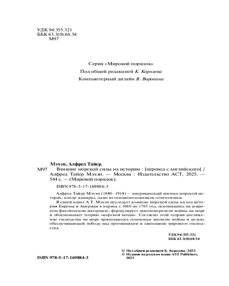 💳 Оплатить за товар можно при получении 🇰🇿 Есть бесплатная доставка по Казахстану от 1 дня 🎁 Копите бонусы с каждой покупки Серия: Мировой порядок Алфред Тайер Мэхэн (1840-1914) — американский военно-морской историк, контр-адмирал, один из основоположников геополитики. В своей книге А.Т. Мэхэн исследует влияние морской силы на ход истории Европы и Америки в период с 1660 по 1783 год, основываясь на широком фактическом материале, формулирует закономерности войны на море и обосновывает теорию «морской мощи». Согласно этой теории достижение господства на море признавалось основным законом войны и целью, обеспечивающей победу над противником и завоевание мирового господства. |