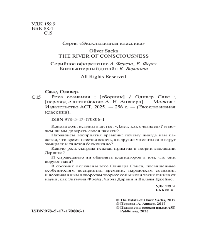 💳 Оплатить за товар можно при получении 🇰🇿 Есть бесплатная доставка по Казахстану от 1 дня 🎁 Копите бонусы с каждой покупки Серия: Эксклюзивная классика Какова доля истины в шутке: «Лжет, как очевидец»? и можем ли мы доверять своей памяти? Парадоксы восприятия времени: почему иногда нам кажется, что время несется вскачь, а в другие моменты оно вдруг замирает и тянется бесконечно? Какую роль сыграла нежная примула в теории эволюции Дарвина? И справедливо ли обвинять плагиаторов в том, что они воруют идеи? В сборник включены эссе Оливера Сакса, посвященные особенностям восприятия времени, парадоксам сознания и неожиданным поворотам творческой мысли таких гениев от науки, как Зигмунд Фрейд, Чарлз Дарвин и Вильям Джеймс. |