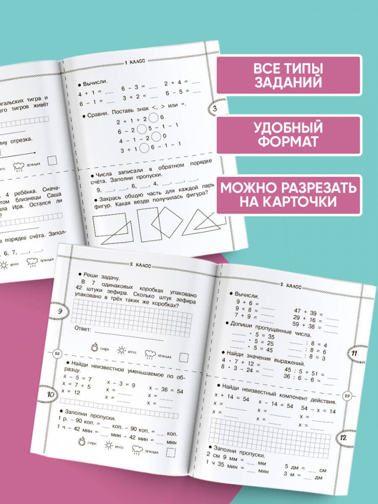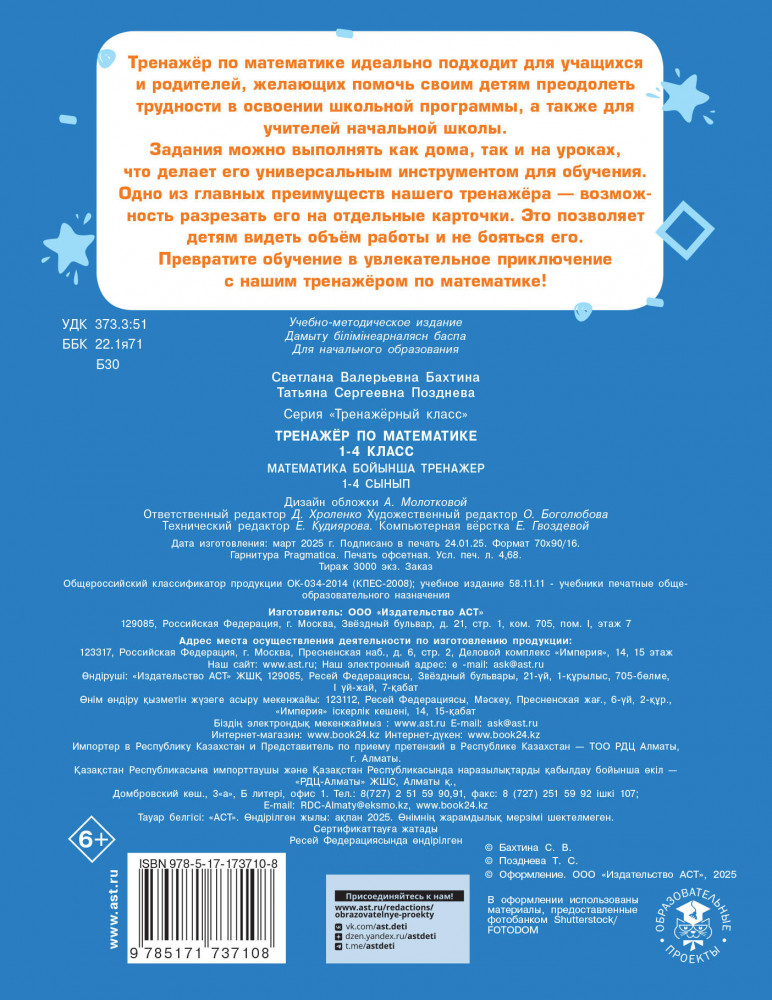 💳 Оплатить за товар можно при получении 🇰🇿 Есть бесплатная доставка по Казахстану от 1 дня 🎁 Копите бонусы с каждой покупки Серия: Тренажерный класс Тренажёр по математике идеально подходит для учащихся и родителей, желающих помочь своим детям преодолеть трудности в освоении школьной программы, а также учителей начальной школы. Задания можно выполнять как дома, так и на уроках, что делает его универсальным инструментом для обучения. Одно из главных преимуществ нашего тренажёра — возможность разрезать его на отдельные карточки. Это позволяет детям видеть объём работы и не бояться его. Превратите обучение в увлекательное приключение с нашим тренажёром математике! |