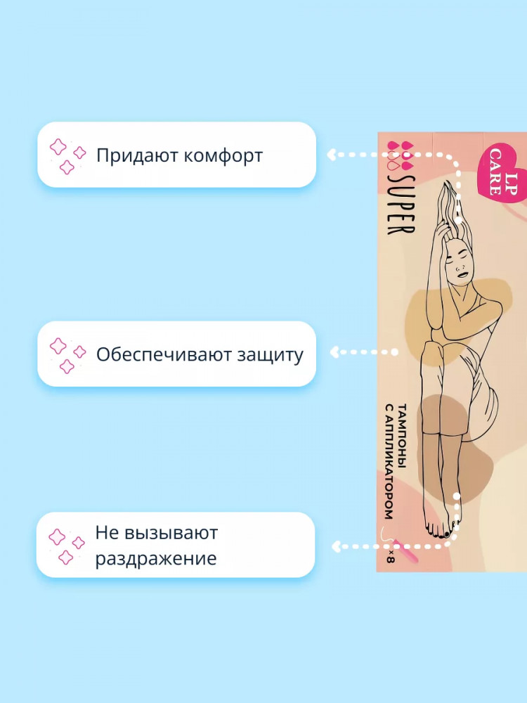 Тампоны LP Care придают комфорт и уверенность, обеспечивая надежную защиту от протеканий. Подходят для женщин с чувствительной кожей и не вызывают раздражение. Каждый тампон в индивидуальной упаковке — удобно брать с собой.