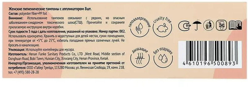 Меры предосторожности: использование тампонов связывают с редким, но опасным заболеванием-синдромом токсического шока(СТШ). Прочитайте и сохраните прилагаемую инструкцию внутри коробки.